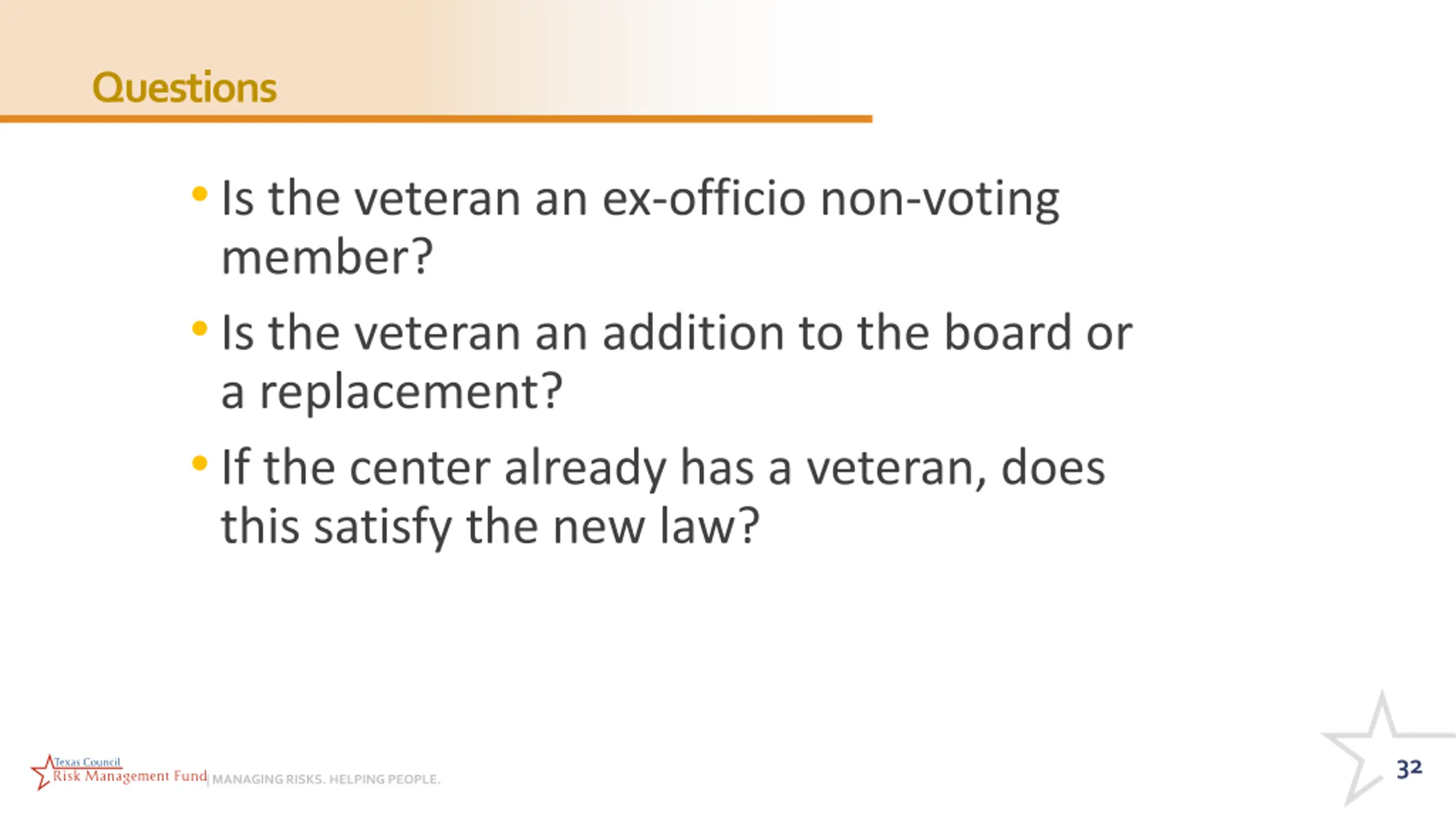Questions Is the veteran an ex-officio non-voting member? Is the veteran an addition to the board or a replacement? If the center already has a veteran, does this satisfy the new law? 32 | MANAGING RISKS. HELPING PEOPLE.