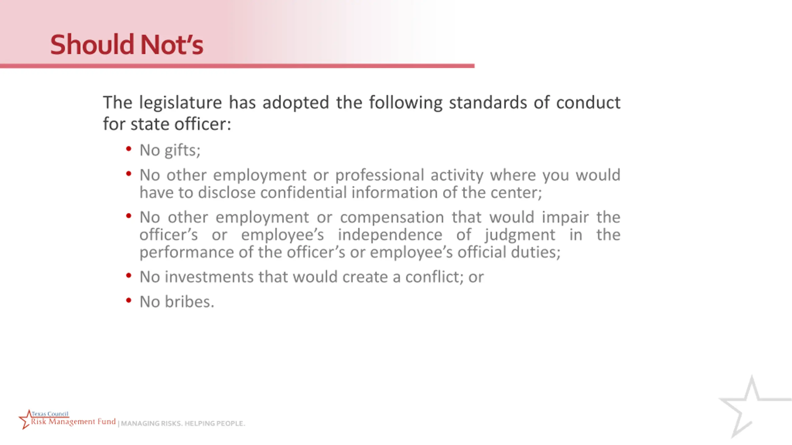 Should Nots The legislature has adopted the following standards of conduct for state officer: No gifts; No other employment or professional activity where you would have to disclose confidential information of the center; No other employment or compensation that would impair the officer s or employee s independence of judgment in the performance of the officer s or employee s official duties; No investments that would create a conflict; or No bribes. | MANAGING RISKS. HELPING PEOPLE.