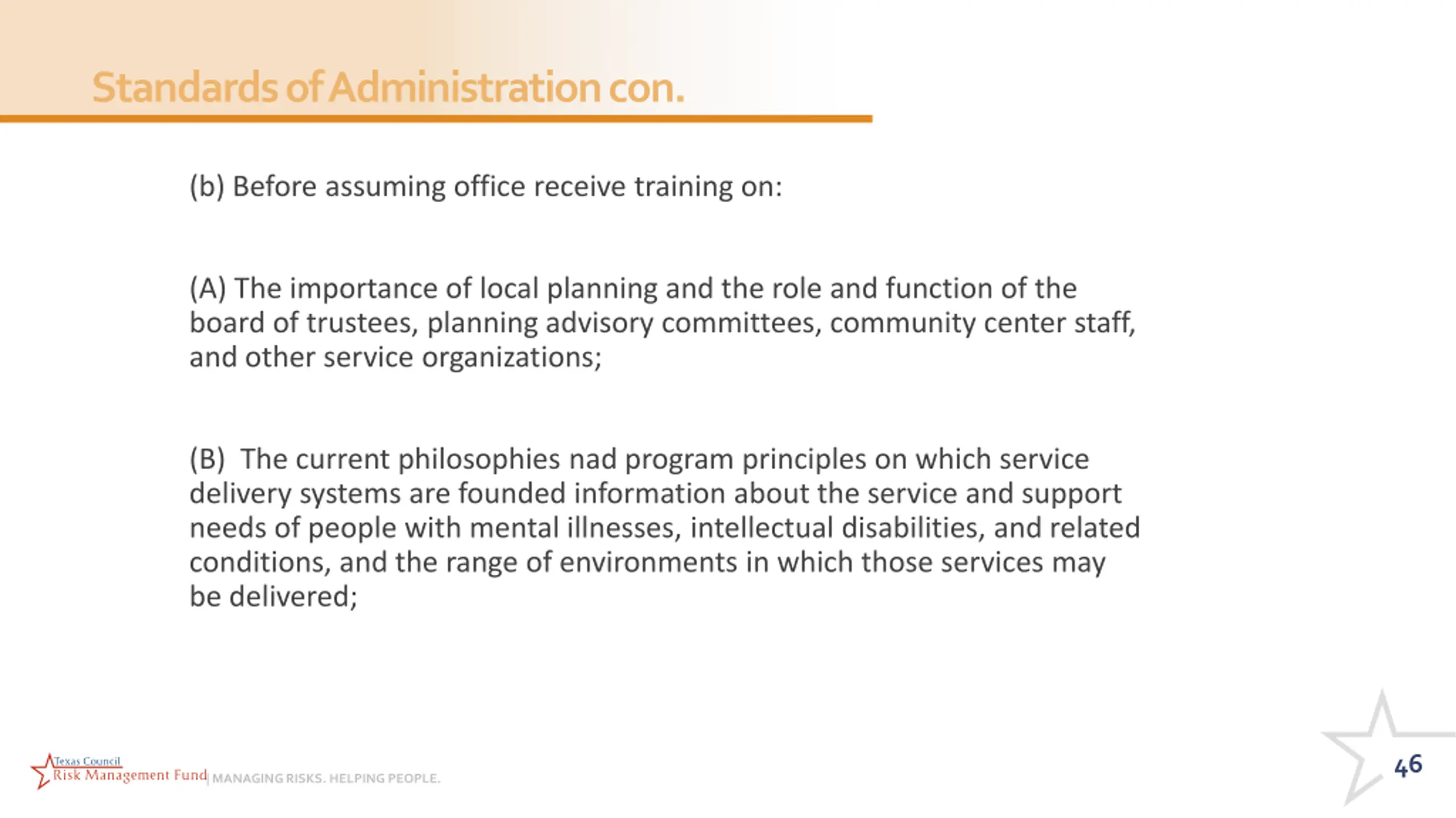 Standards of Administration con. (b) Before assuming office receive training on: (A) The importance of local planning and the role and function of the board of trustees, planning advisory committees, community center staff, and other service organizations; (B) The current philosophies nad program principles on which service delivery systems are founded information about the service and support needs of people with mental illnesses, intellectual disabilities, and related conditions, and the range of environments in which those services may be delivered; 46 | MANAGING RISKS. HELPING PEOPLE.