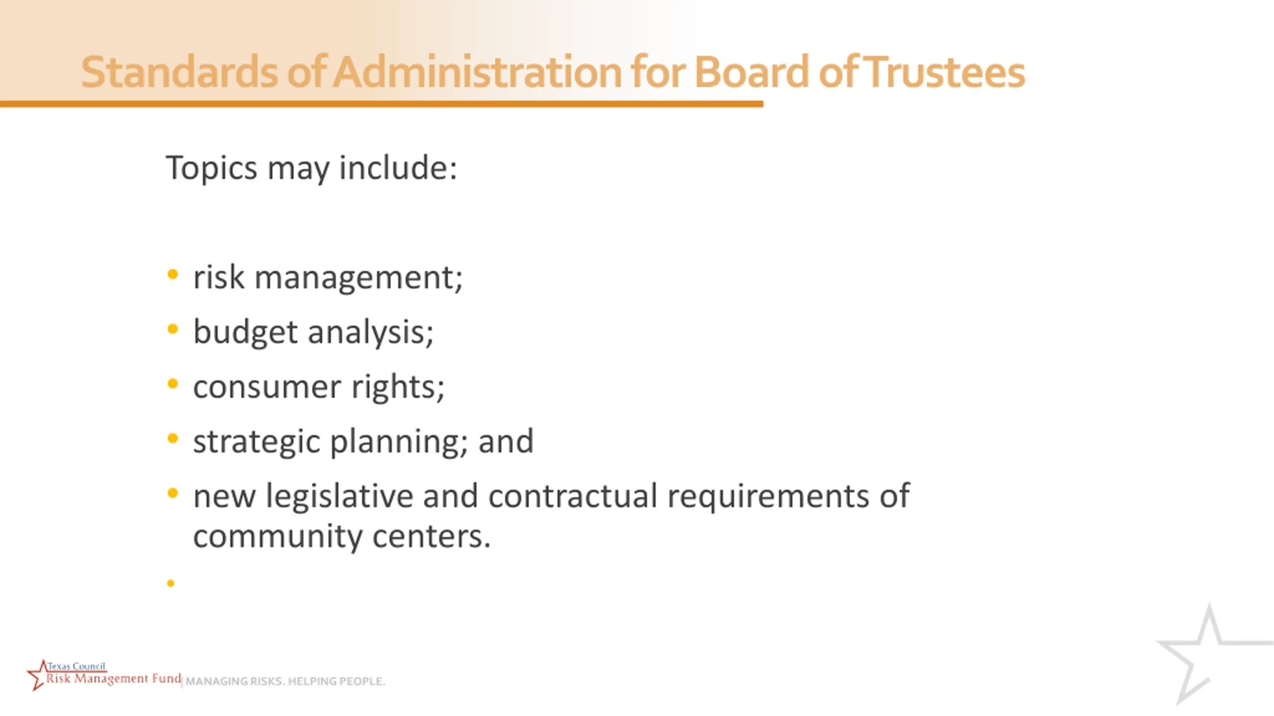Standards of Administration for Board of Trustees Topics may include: risk management; budget analysis; consumer rights; strategic planning; and new legislative and contractual requirements of community centers. | MANAGING RISKS. HELPING PEOPLE.