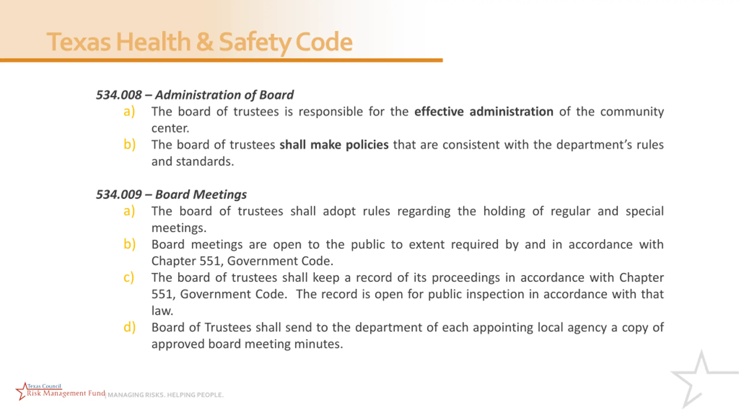 Texas Health & Safety Code 534.008 Administration of Board a) The board of trustees is responsible for the effective administration of the community center. b) The board of trustees shall make policies that are consistent with the department s rules and standards. 534.009 Board Meetings a) The board of trustees shall adopt rules regarding the holding of regular and special meetings. b) Board meetings are open to the public to extent required by and in accordance with Chapter 551, Government Code. c) The board of trustees shall keep a record of its proceedings in accordance with Chapter 551, Government Code. The record is open for public inspection in accordance with that law. d) Board of Trustees shall send to the department of each appointing local agency a copy of approved board meeting minutes. | MANAGING RISKS. HELPING PEOPLE.