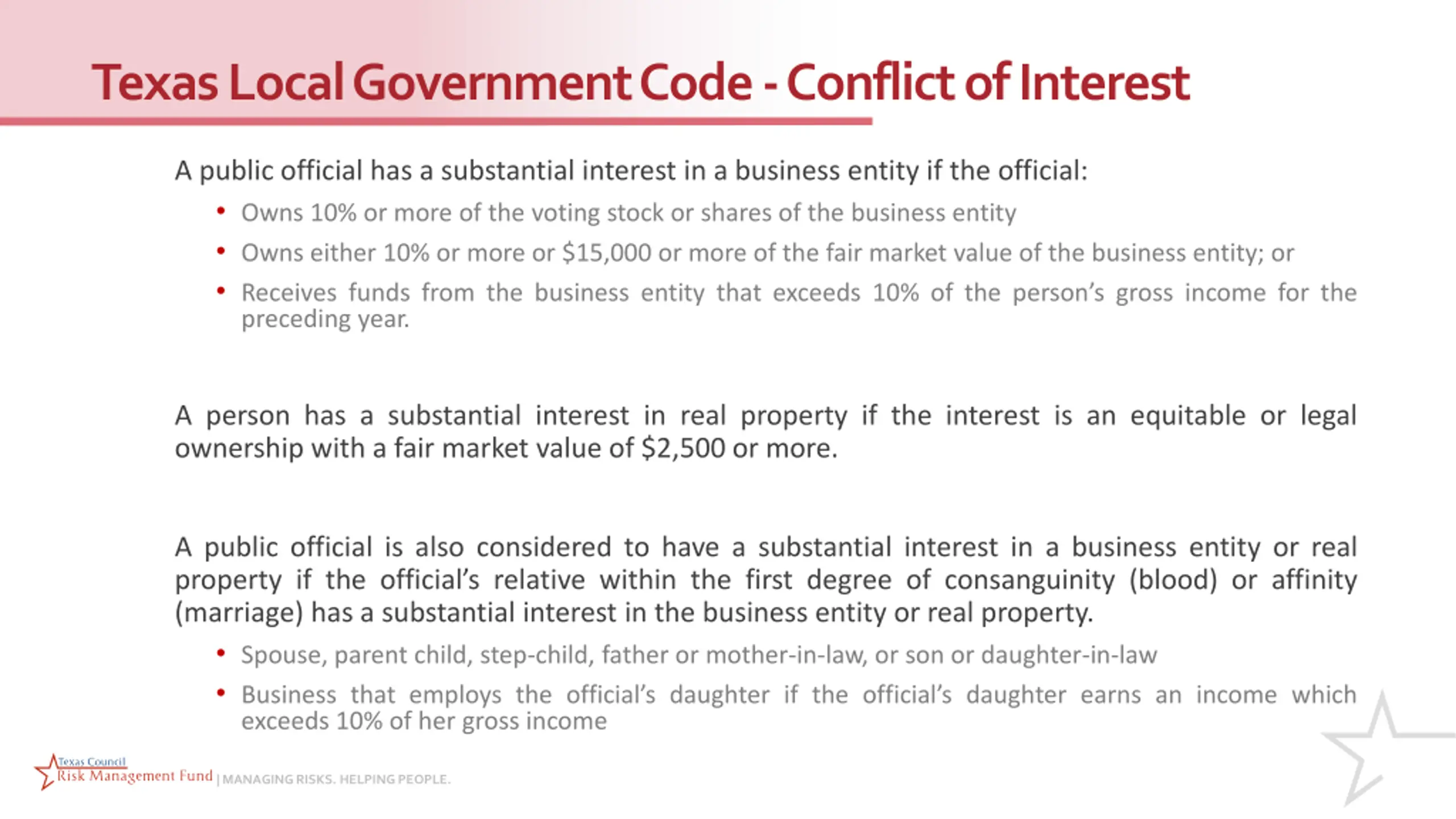 Texas Local Government Code - Conflict of Interest A public official has a substantial interest in a business entity if the official: Owns 10% or more of the voting stock or shares of the business entity Owns either 10% or more or $15,000 or more of the fair market value of the business entity; or Receives funds from the business entity that exceeds 10% of the person s gross income for the preceding year. A person has a substantial interest in real property if the interest is an equitable or legal ownership with a fair market value of $2,500 or more. A public official is also considered to have a substantial interest in a business entity or real property if the official s relative within the first degree of consanguinity (blood) or affinity (marriage) has a substantial interest in the business entity or real property. Spouse, parent child, step-child, father or mother-in-law, or son or daughter-in-law Business that employs the official s daughter if the official s daughter earns an income which exceeds 10% of her gross income | MANAGING RISKS. HELPING PEOPLE.
