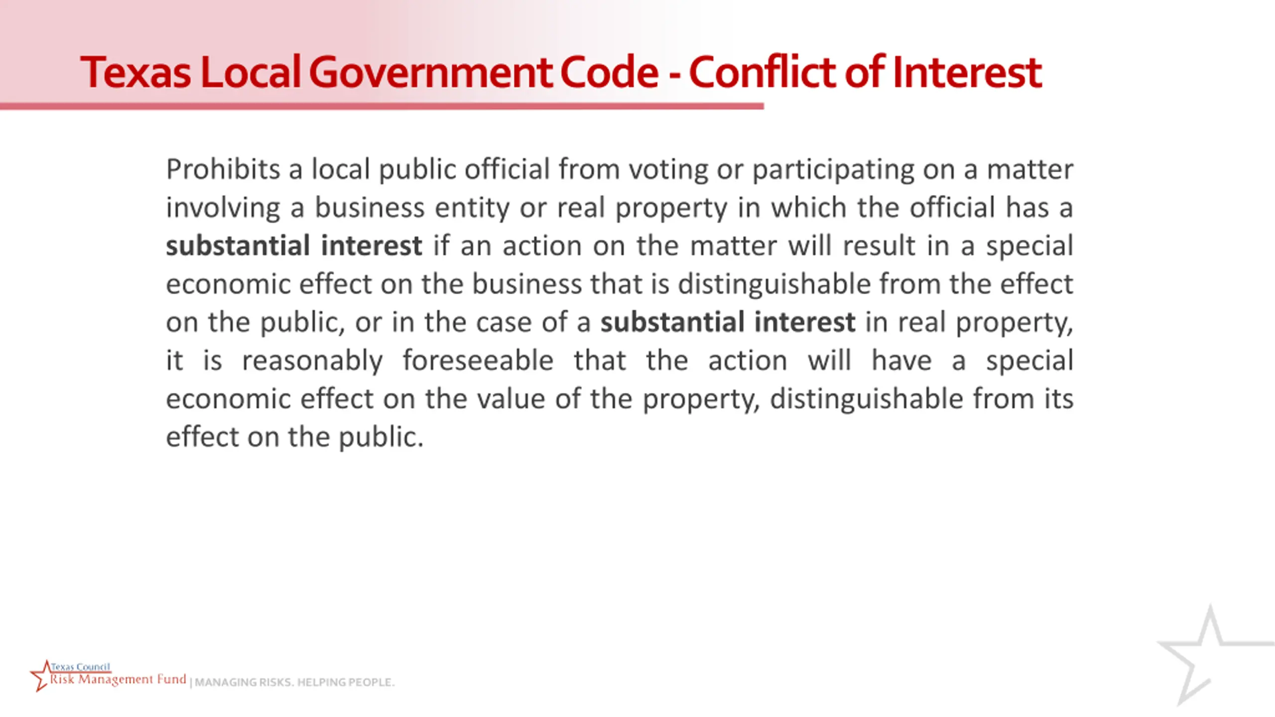 Texas Local Government Code - Conflict of Interest Prohibits a local public official from voting or participating on a matter involving a business entity or real property in which the official has a substantial interest if an action on the matter will result in a special economic effect on the business that is distinguishable from the effect on the public, or in the case of a substantial interest in real property, it is reasonably foreseeable that the action will have a special economic effect on the value of the property, distinguishable from its effect on the public. | MANAGING RISKS. HELPING PEOPLE.