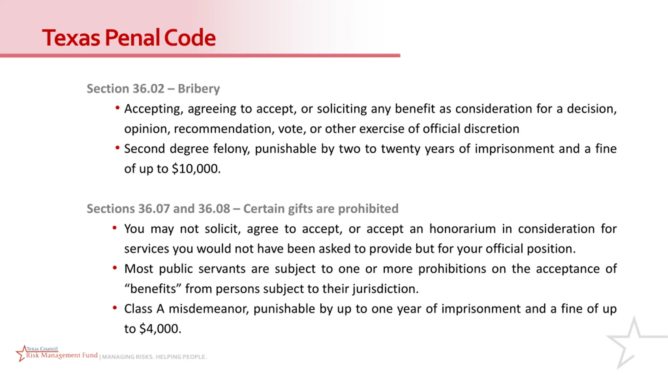 Texas Penal Code Section 36.02 Bribery Accepting, agreeing to accept, or soliciting any benefit as consideration for a decision, opinion, recommendation, vote, or other exercise of official discretion Second degree felony, punishable by two to twenty years of imprisonment and a fine of up to $10,000. Sections 36.07 and 36.08 Certain gifts are prohibited You may not solicit, agree to accept, or accept an honorarium in consideration for services you would not have been asked to provide but for your official position. Most public servants are subject to one or more prohibitions on the acceptance of benefits from persons subject to their jurisdiction. Class A misdemeanor, punishable by up to one year of imprisonment and a fine of up to $4,000. | MANAGING RISKS. HELPING PEOPLE.