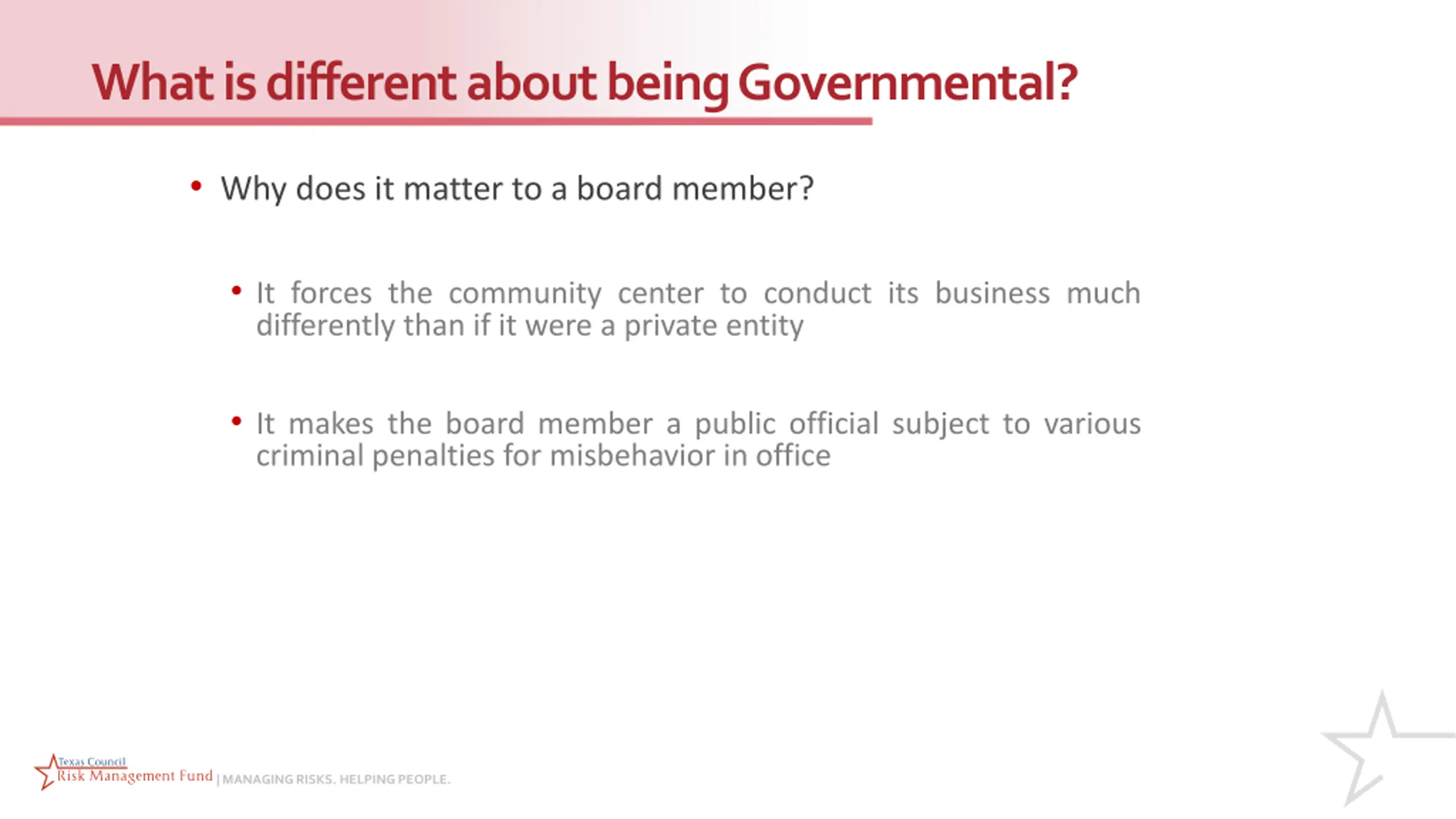 What is different about being Governmental? Why does it matter to a board member? It forces the community center to conduct its business much differently than if it were a private entity It makes the board member a public official subject to various criminal penalties for misbehavior in office | MANAGING RISKS. HELPING PEOPLE.
