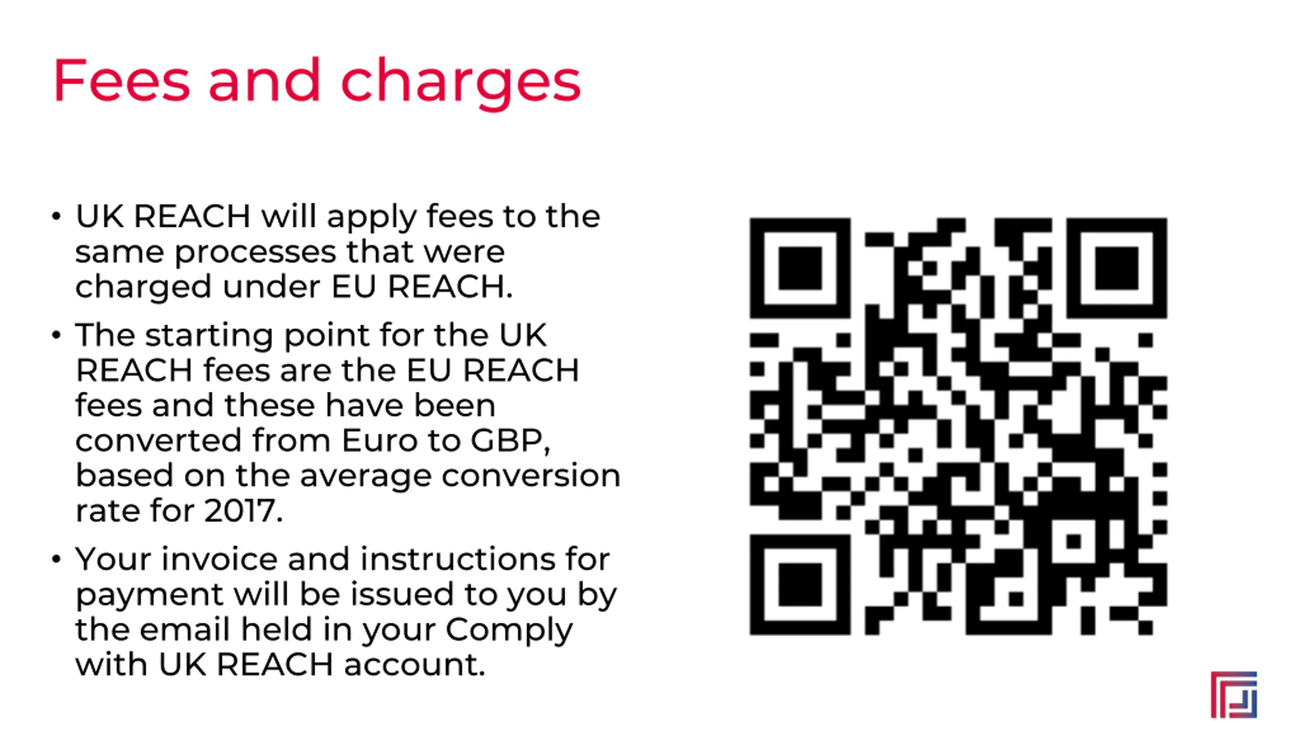 Fees and charges UK REACH will apply fees to the same processes that were charged under EU REACH. The starting point for the UK REACH fees are the EU REACH fees and these have been converted from Euro to GBP, based on the average conversion rate for 2017. Your invoice and instructions for payment will be issued to you by the email held in your Comply with UK REACH account.