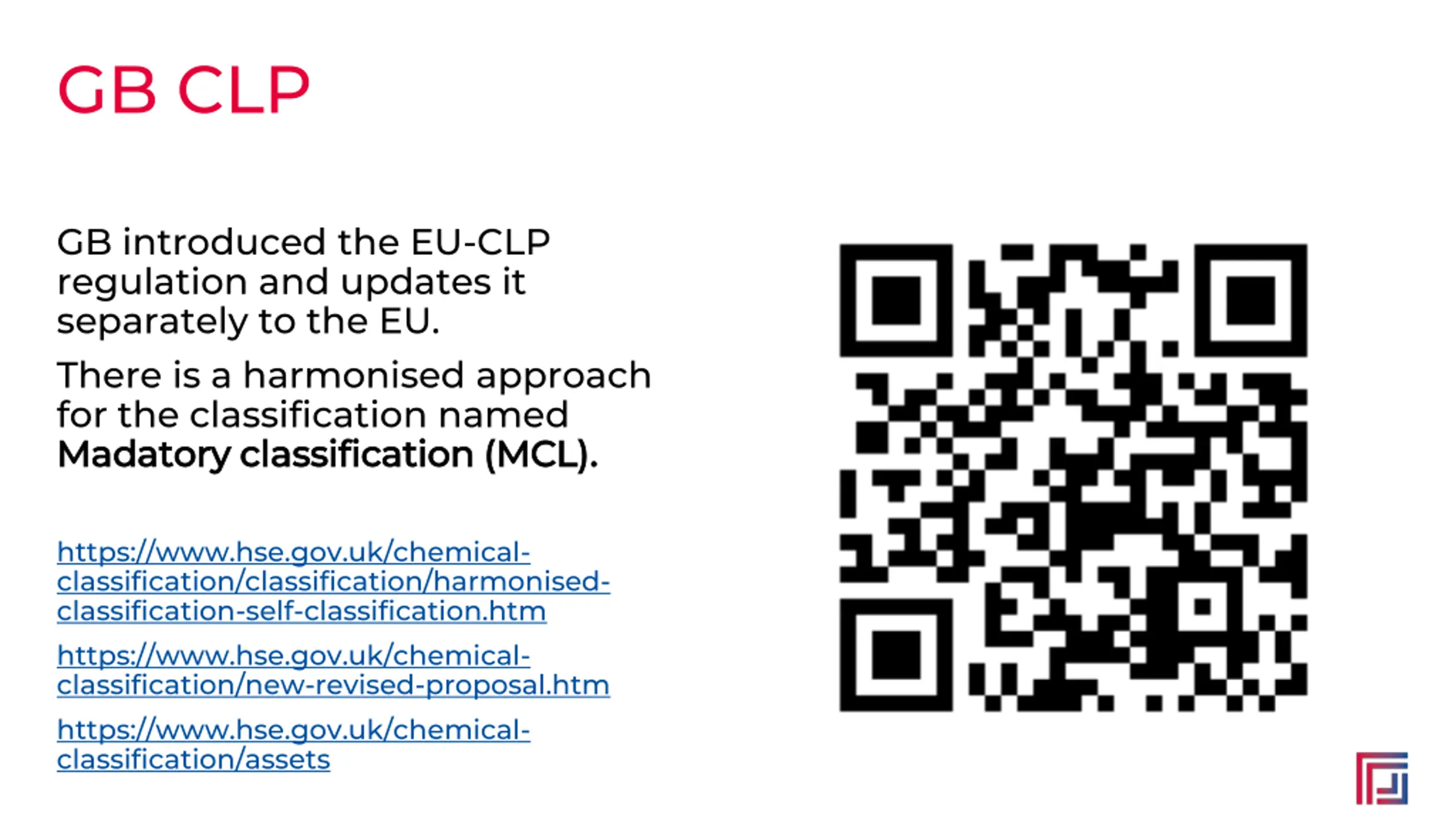 GB CLP GB introduced the EU-CLP regulation and updates it separately to the EU. There is a harmonised approach for the classification named Madatory classification (MCL). Madatory classification (MCL). https://www.hse.gov.uk/chemical- classification/classification/harmonised- classification-self-classification.htm https://www.hse.gov.uk/chemical- classification/new-revised-proposal.htm https://www.hse.gov.uk/chemical- classification/assets