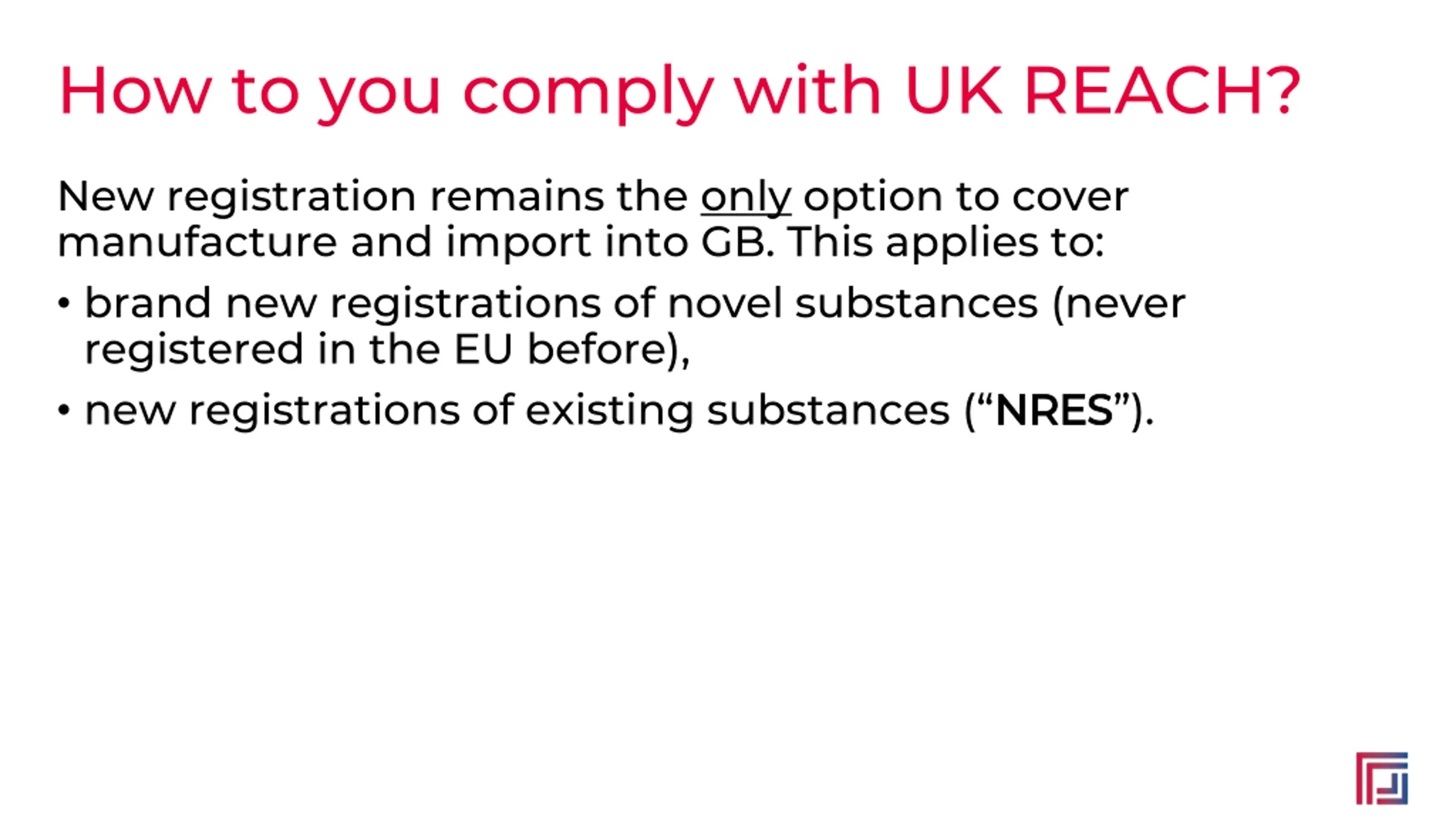 How to you comply with UK REACH? New registration remains the only option to cover manufacture and import into GB. This applies to: brand new registrations of novel substances (never registered in the EU before), new registrations of existing substances ( NRES NRES ).