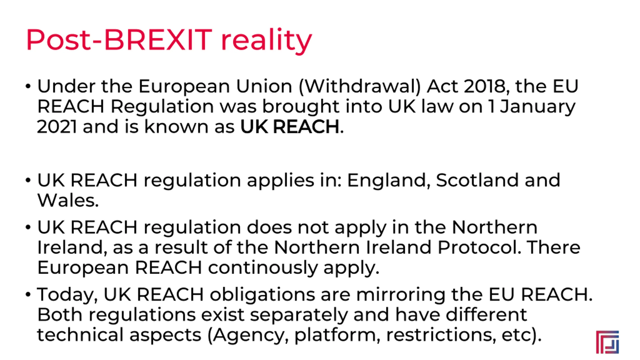 Post-BREXIT reality Under the European Union (Withdrawal) Act 2018, the EU REACH Regulation was brought into UK law on 1 January 2021 and is known as UK REACH UK REACH. UK REACH regulation applies in: England, Scotland and Wales. UK REACH regulation does not apply in the Northern Ireland, as a result of the Northern Ireland Protocol. There European REACH continously apply. Today, UK REACH obligations are mirroring the EU REACH. Both regulations exist separately and have different technical aspects (Agency, platform, restrictions, etc).