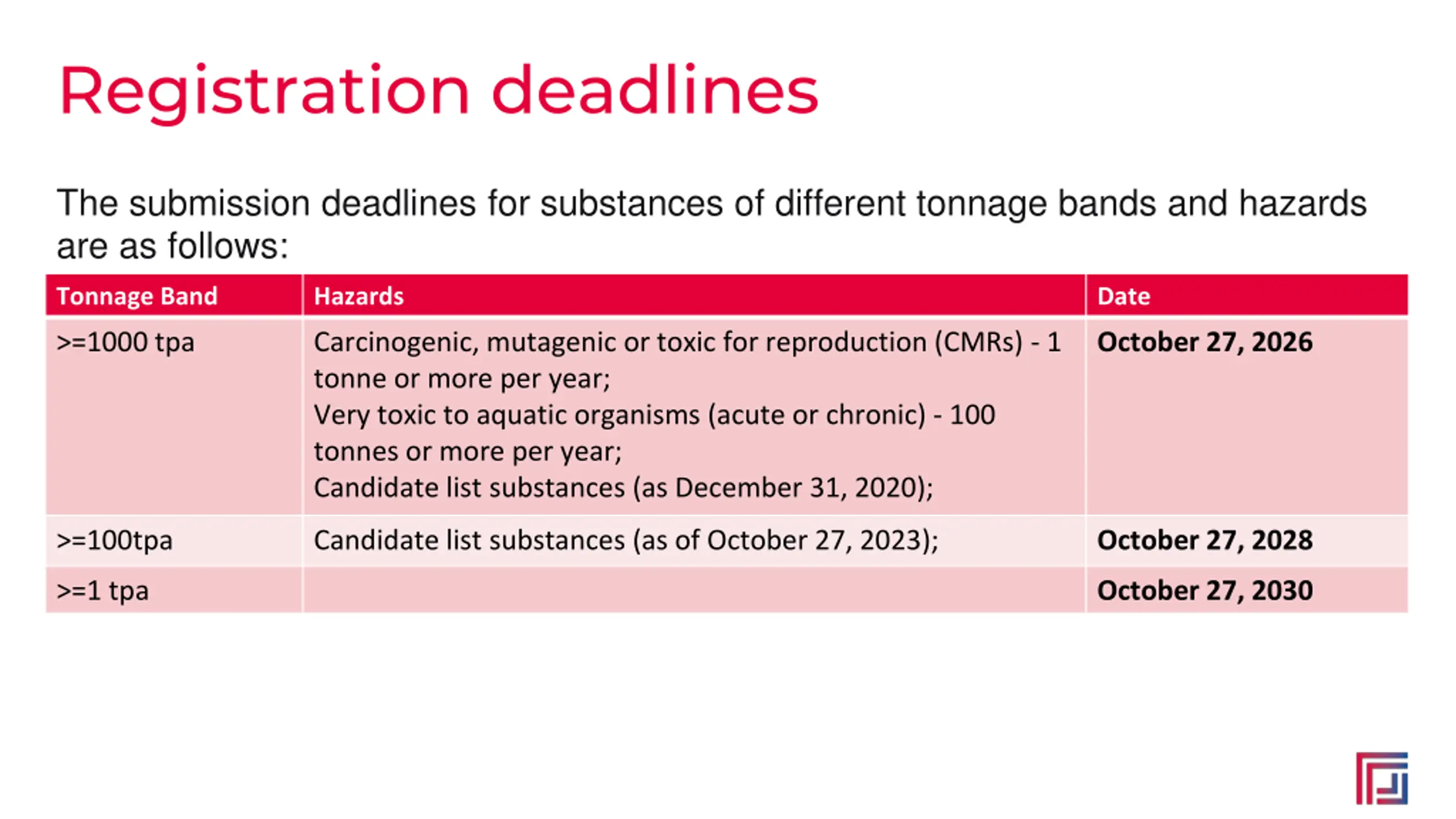 Registration deadlines The submission deadlines for substances of different tonnage bands and hazards are as follows: Tonnage Band Hazards Date >=1000 tpa Carcinogenic, mutagenic or toxic for reproduction (CMRs) - 1 tonne or more per year; Very toxic to aquatic organisms (acute or chronic) - 100 tonnes or more per year; Candidate list substances (as December 31, 2020); October 27, 2026 >=100tpa Candidate list substances (as of October 27, 2023); October 27, 2028 >=1 tpa October 27, 2030