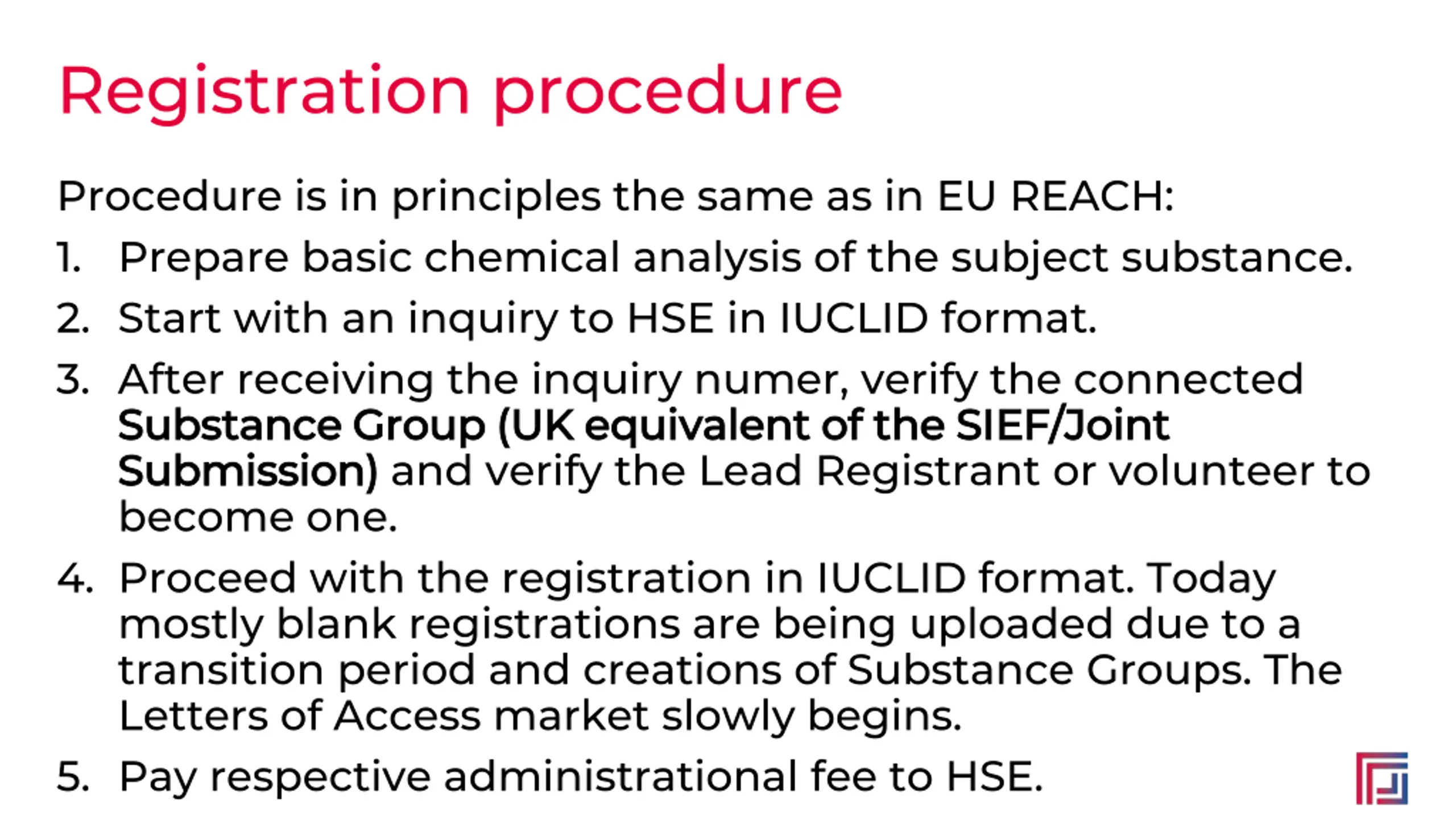 Registration procedure Procedure is in principles the same as in EU REACH: 1. Prepare basic chemical analysis of the subject substance. 2. Start with an inquiry to HSE in IUCLID format. 3. After receiving the inquiry numer, verify the connected Substance Group (UK equivalent of the SIEF/Joint Substance Group (UK equivalent of the SIEF/Joint Submission) Submission) and verify the Lead Registrant or volunteer to become one. 4. Proceed with the registration in IUCLID format. Today mostly blank registrations are being uploaded due to a transition period and creations of Substance Groups. The Letters of Access market slowly begins. 5. Pay respective administrational fee to HSE.