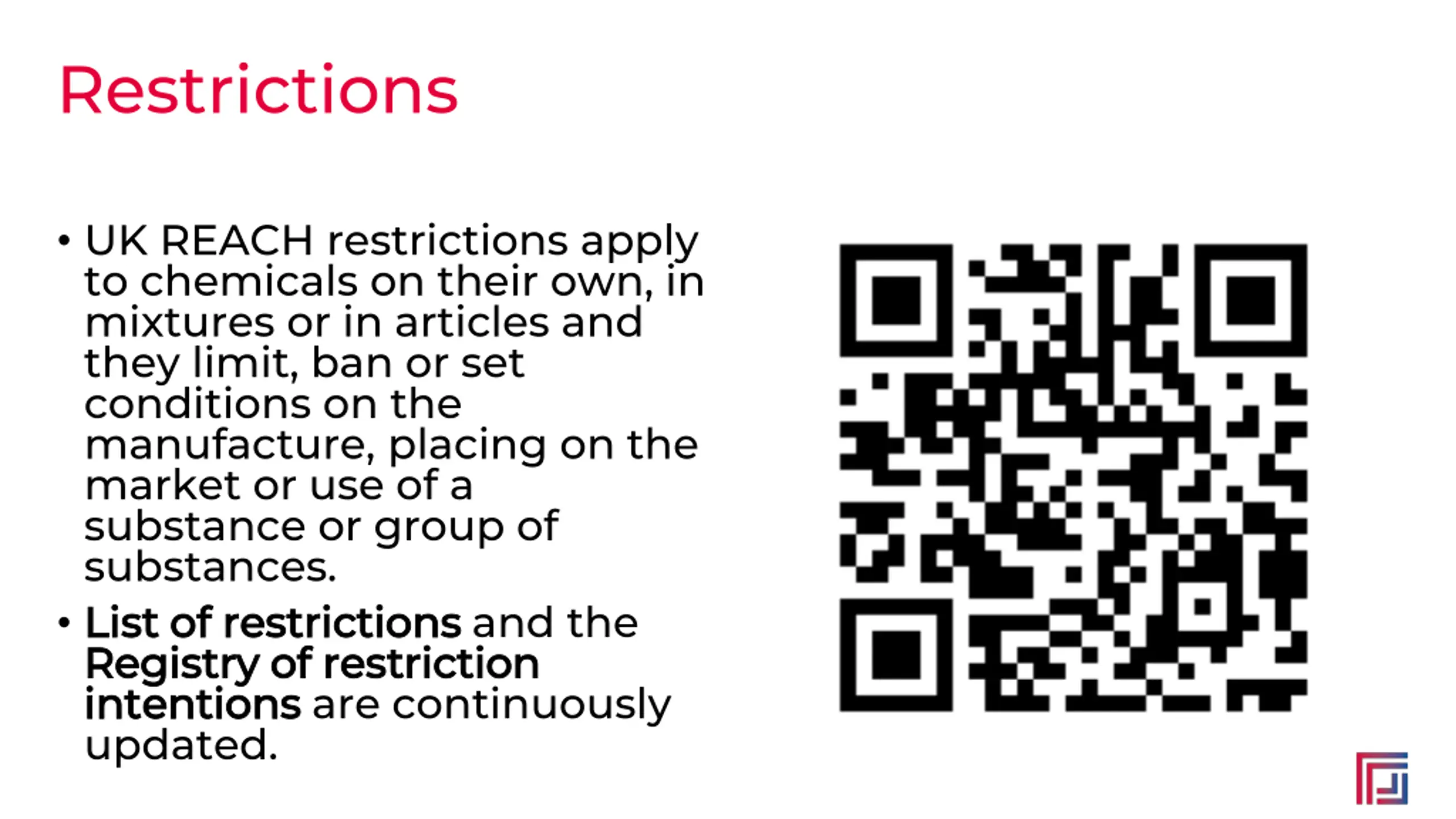 Restrictions UK REACH restrictions apply to chemicals on their own, in mixtures or in articles and they limit, ban or set conditions on the manufacture, placing on the market or use of a substance or group of substances. List of restrictions List of restrictions and the Registry of restriction Registry of restriction intentions intentions are continuously updated.