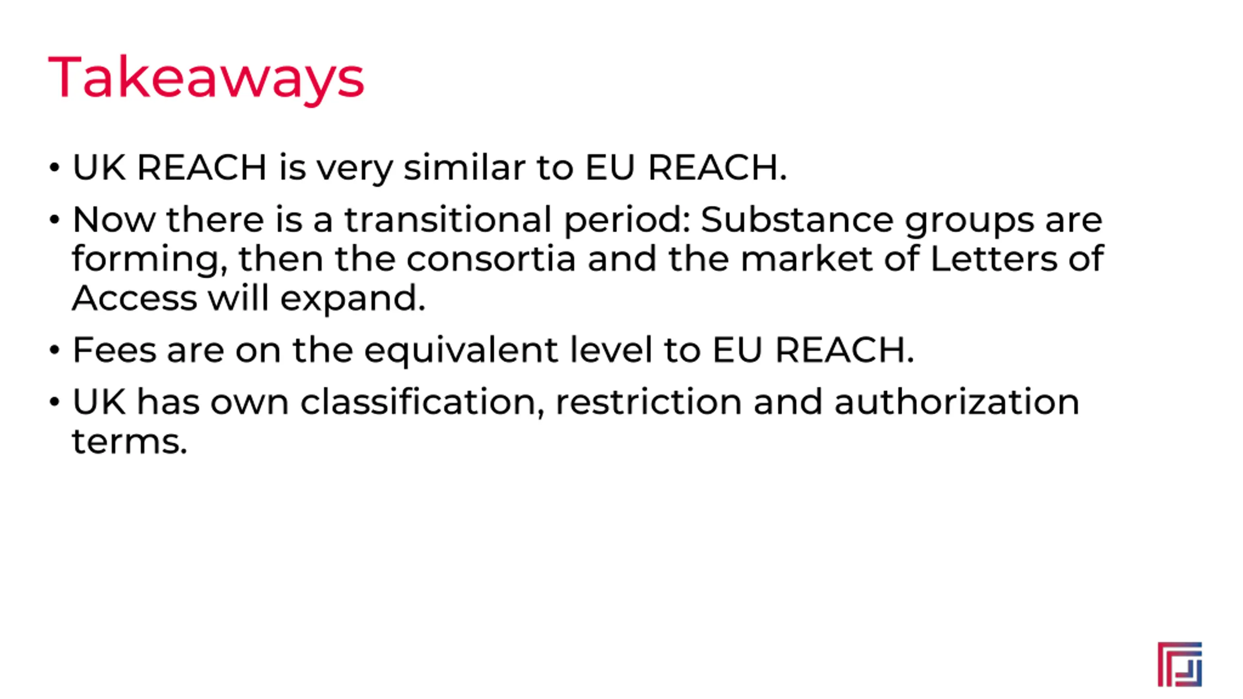 Takeaways UK REACH is very similar to EU REACH. Now there is a transitional period: Substance groups are forming, then the consortia and the market of Letters of Access will expand. Fees are on the equivalent level to EU REACH. UK has own classification, restriction and authorization terms.