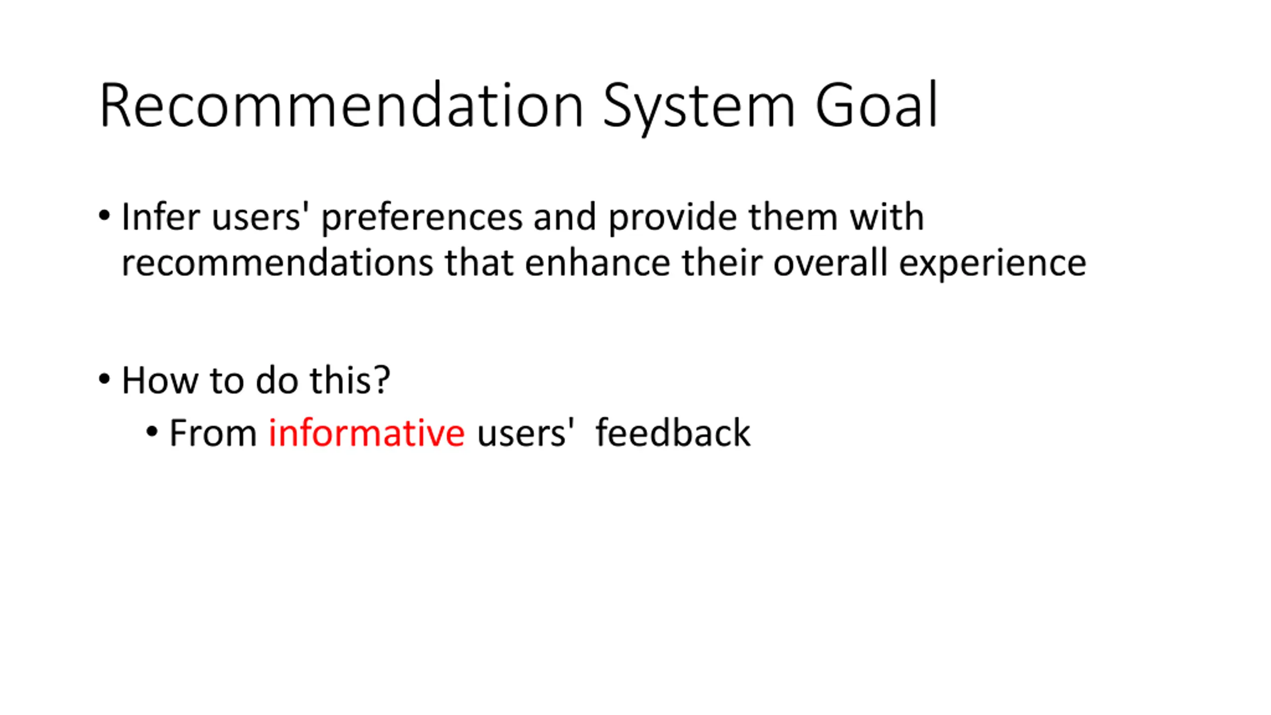 Recommendation System Goal Infer users' preferences and provide them with recommendations that enhance their overall experience How to do this? From informative users' feedback