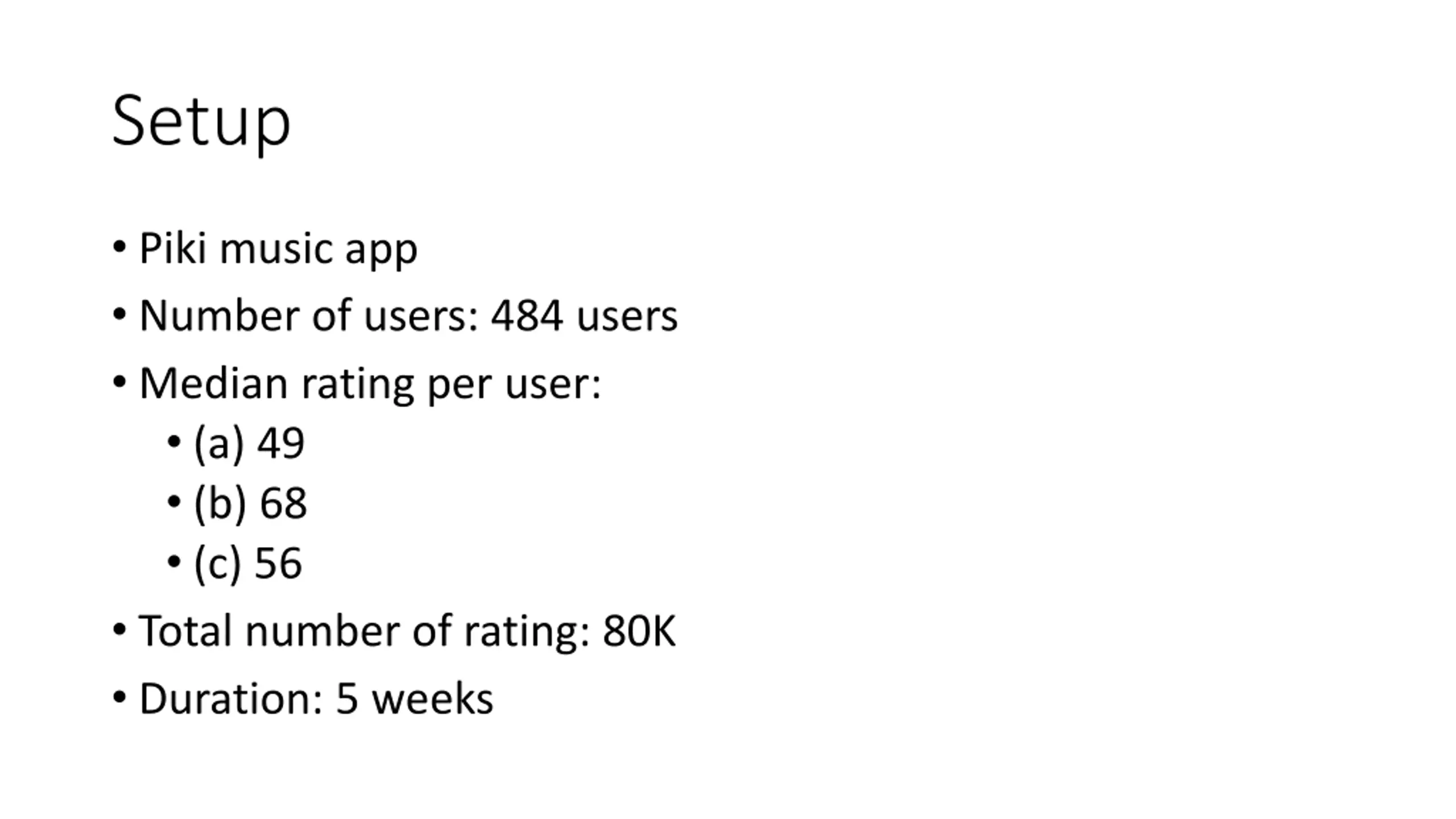 Setup Piki music app Number of users: 484 users Median rating per user: (a) 49 (b) 68 (c) 56 Total number of rating: 80K Duration: 5 weeks
