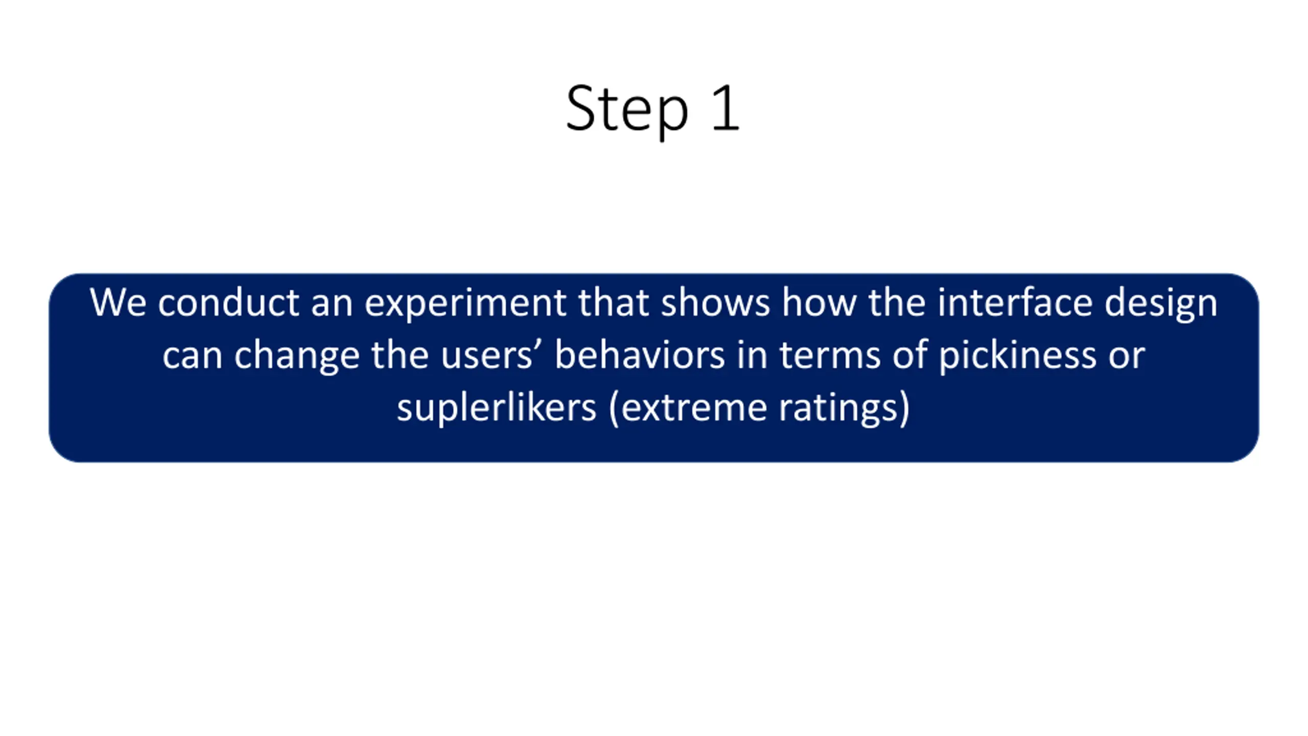 Step 1 We conduct an experiment that shows how the interface design can change the users behaviors in terms of pickiness or suplerlikers (extreme ratings)