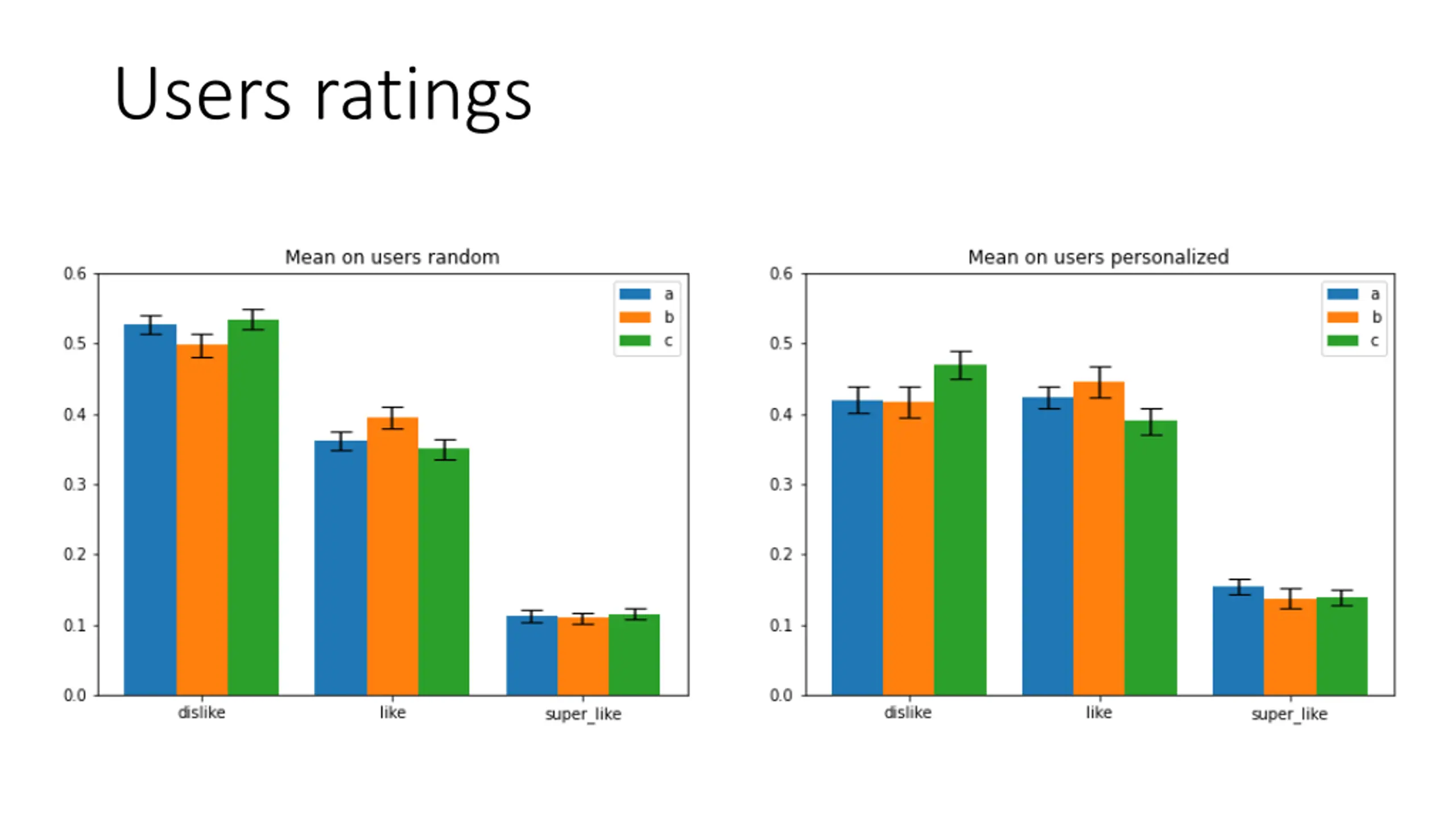 Three Treatment Groups Treatment Dislike lock time Like lock time Superlike lock time a 3 3 12 b 3 6 12 c 3 9 12 Online A/B/C test in which we changed the timer period of the like button to be unlocked