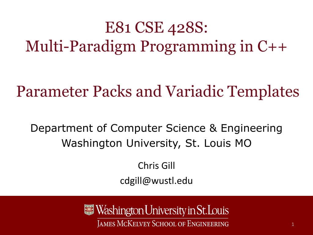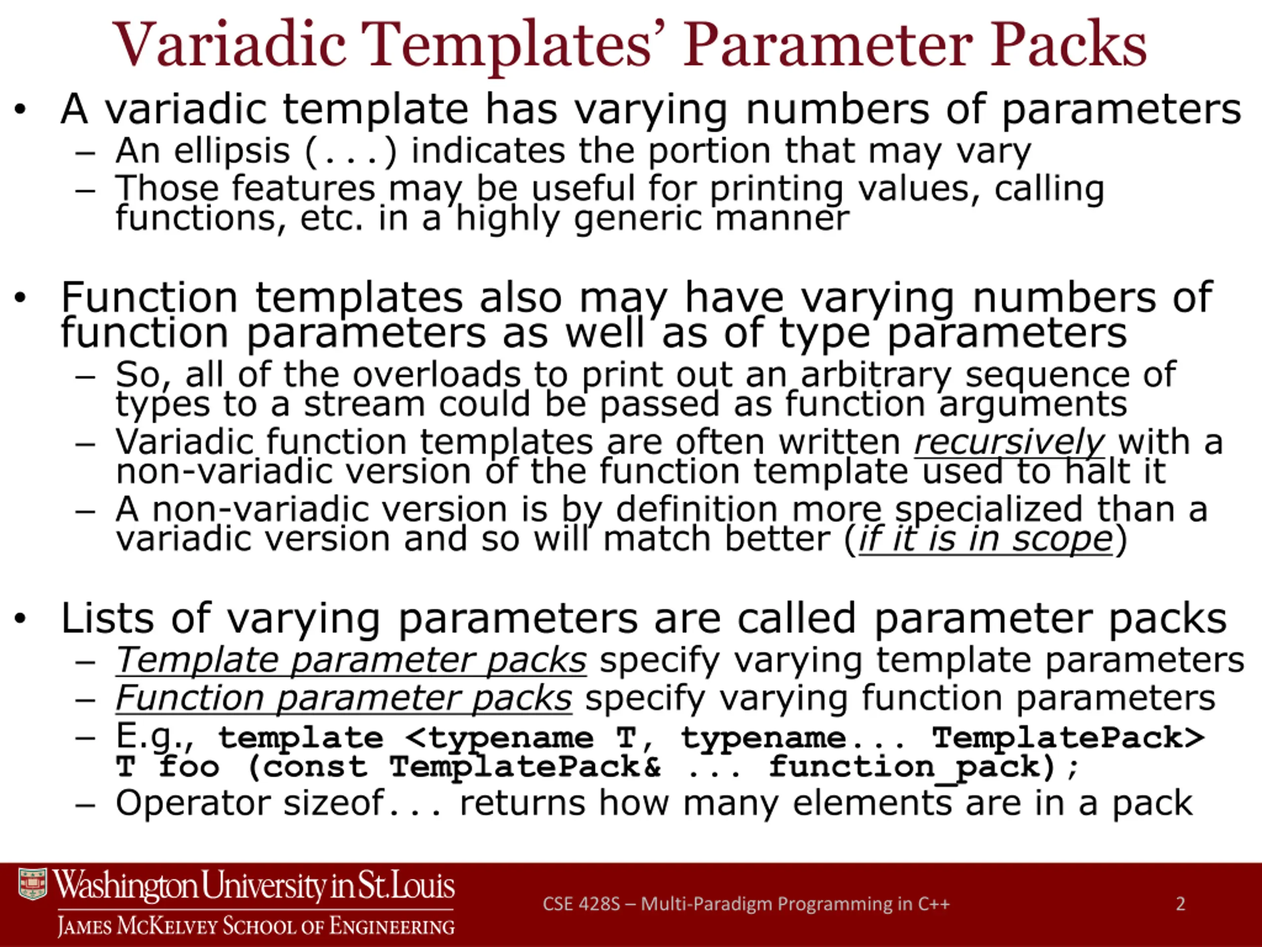 E81 CSE 428S: Multi-Paradigm Programming in C++ Parameter Packs and Variadic Templates Department of Computer Science & Engineering Washington University, St. Louis MO Chris Gill cdgill@wustl.edu 1