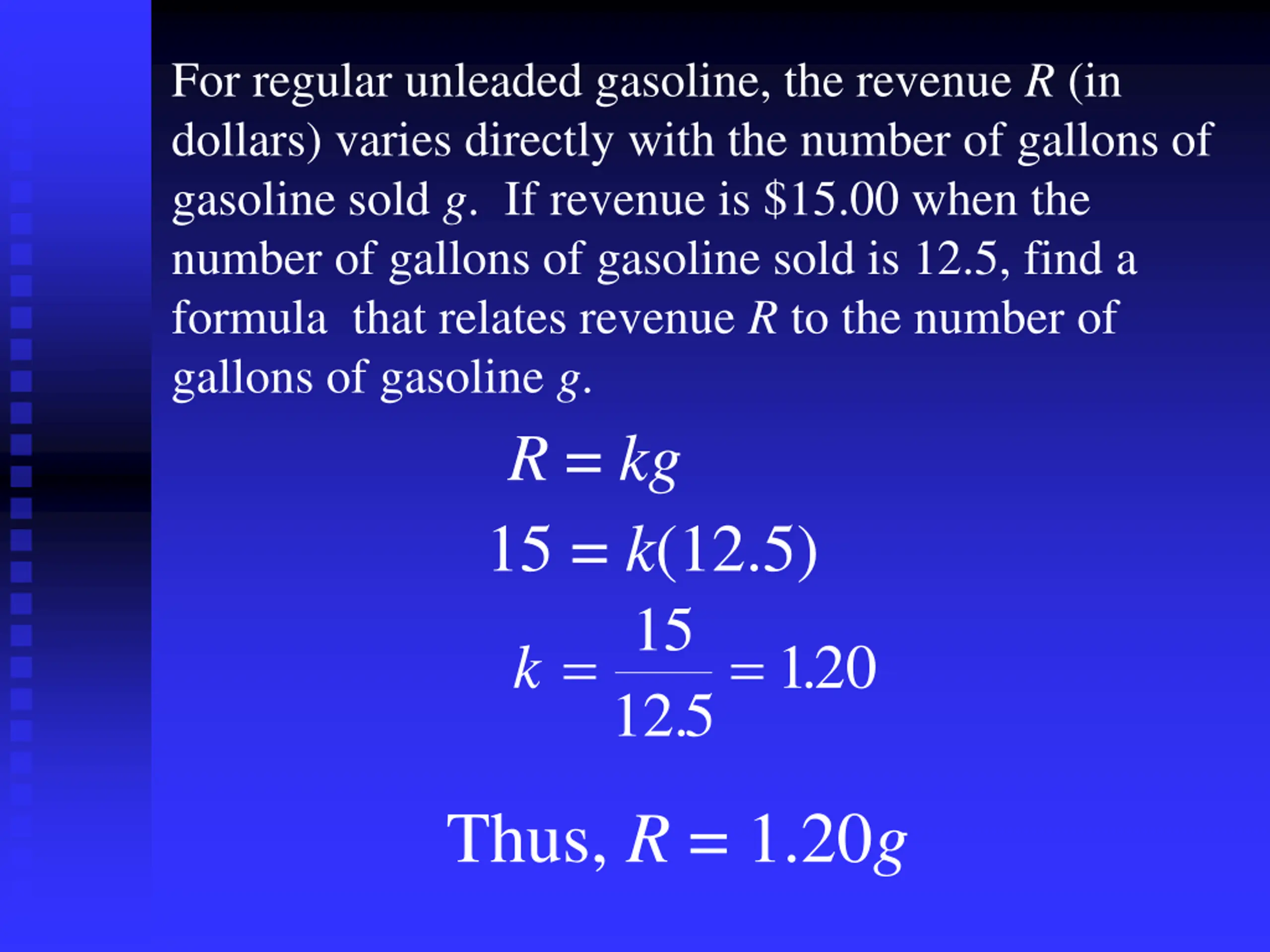For regular unleaded gasoline, the revenue R (in dollars) varies directly with the number of gallons of gasoline sold g. If revenue is $15.00 when the number of gallons of gasoline sold is 12.5, find a formula that relates revenue R to the number of gallons of gasoline g. R = kg 15 = k(12.5) 15 125 . k = = 120 . Thus, R = 1.20g