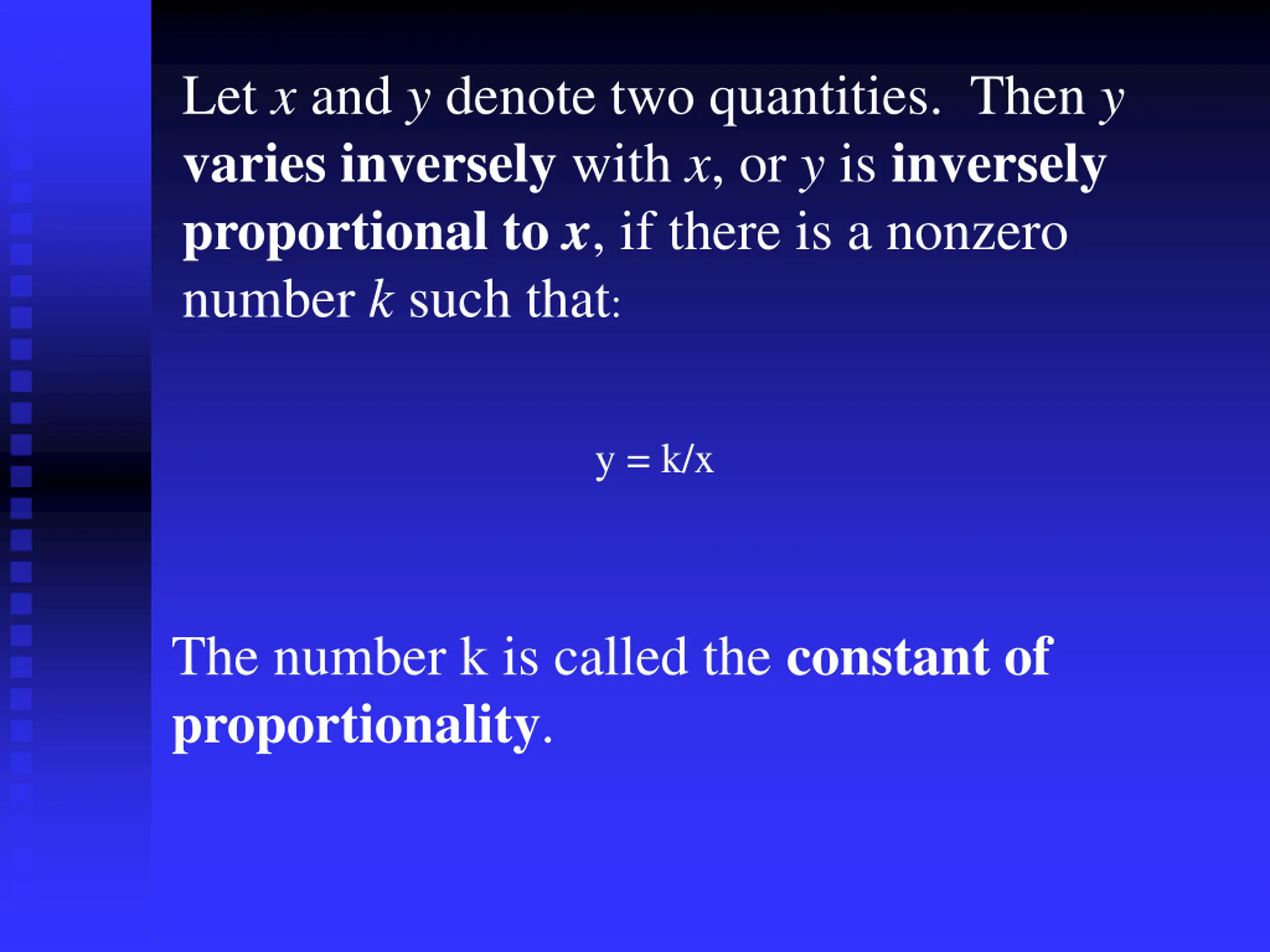 Let x and y denote two quantities. Then y varies inversely with x, or y is inversely proportional to x, if there is a nonzero number k such that: y = k/x The number k is called the constant of proportionality.