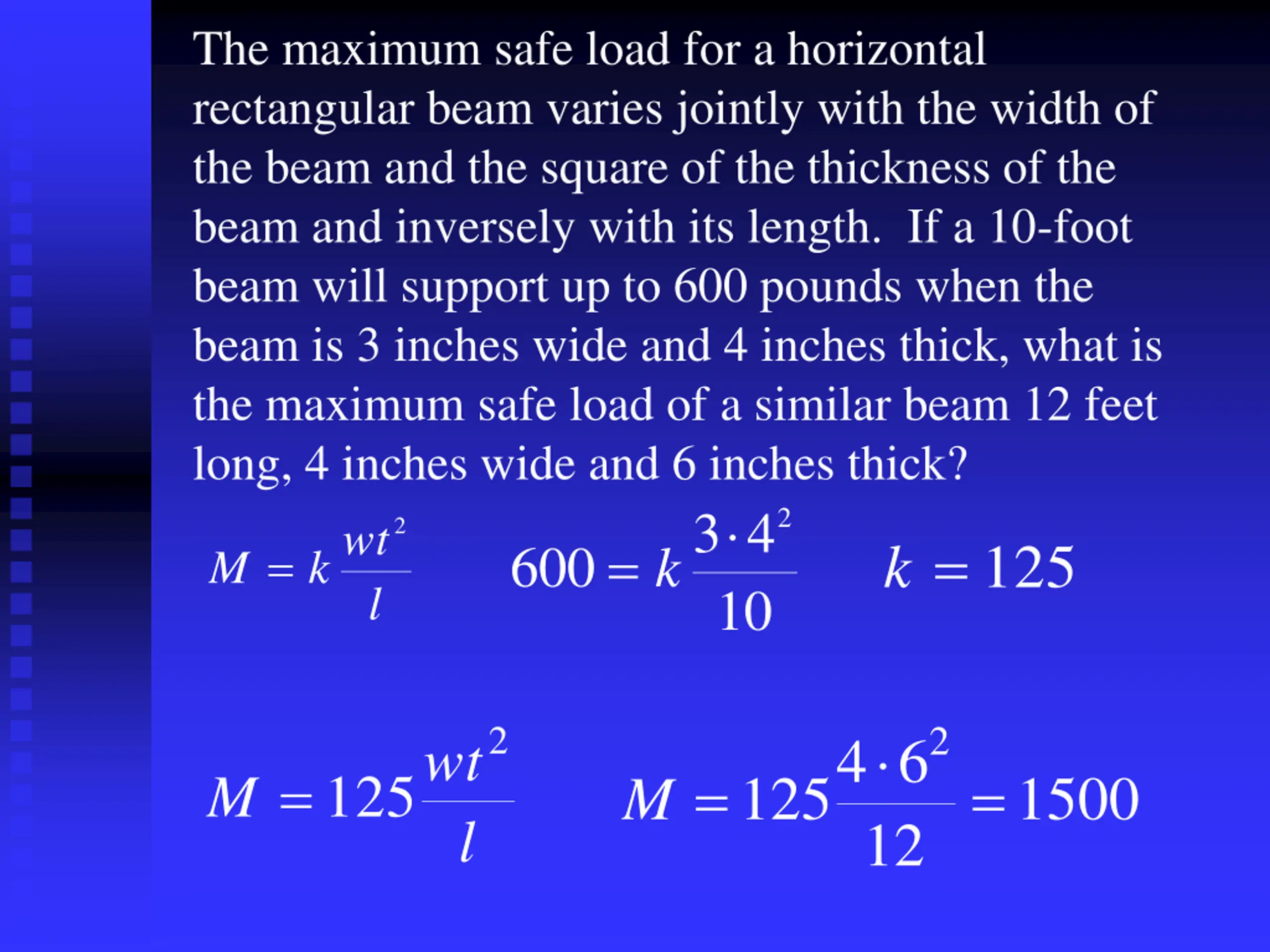The maximum safe load for a horizontal rectangular beam varies jointly with the width of the beam and the square of the thickness of the beam and inversely with its length. If a 10-foot beam will support up to 600 pounds when the beam is 3 inches wide and 4 inches thick, what is the maximum safe load of a similar beam 12 feet long, 4 inches wide and 6 inches thick? kwt l 3 4 10 2 2 k = 125 = 600 k = M 2 2 1254 6 wt =125 M = = M 1500 l 12