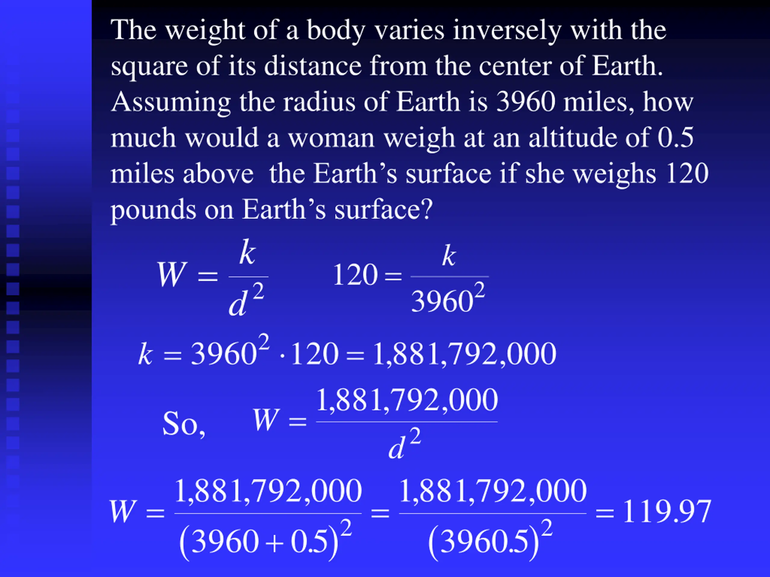 The weight of a body varies inversely with the square of its distance from the center of Earth. Assuming the radius of Earth is 3960 miles, how much would a woman weigh at an altitude of 0.5 miles above the Earth s surface if she weighs 120 pounds on Earth s surface? k d k = = 3960 120 1881792 000 , =1881792 000 2 k = W = 120 39602 2 2 , , , , , W So, d 1881792 000 3960 , , , 1881792 000 39605 , , , W = = = 119 97 . ( ( ) ) 2 2 + 05 . .