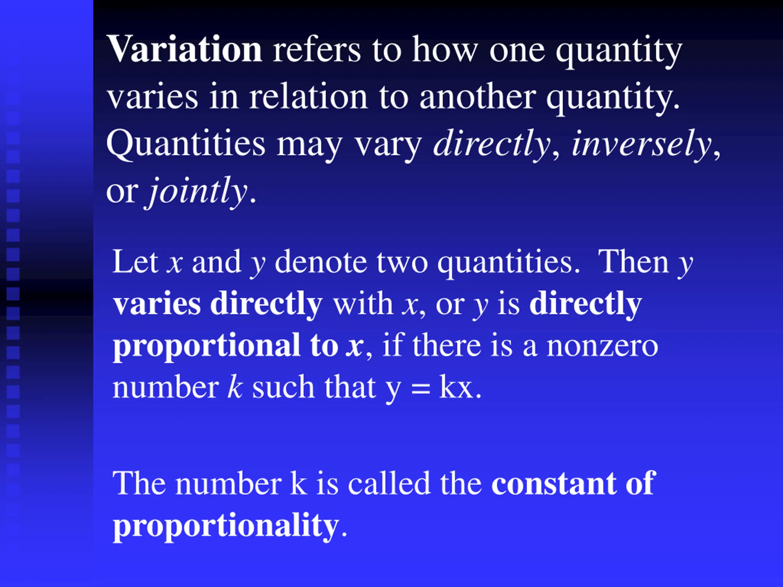 Variation refers to how one quantity varies in relation to another quantity. Quantities may vary directly, inversely, or jointly. Let x and y denote two quantities. Then y varies directly with x, or y is directly proportional to x, if there is a nonzero number k such that y = kx. The number k is called the constant of proportionality.