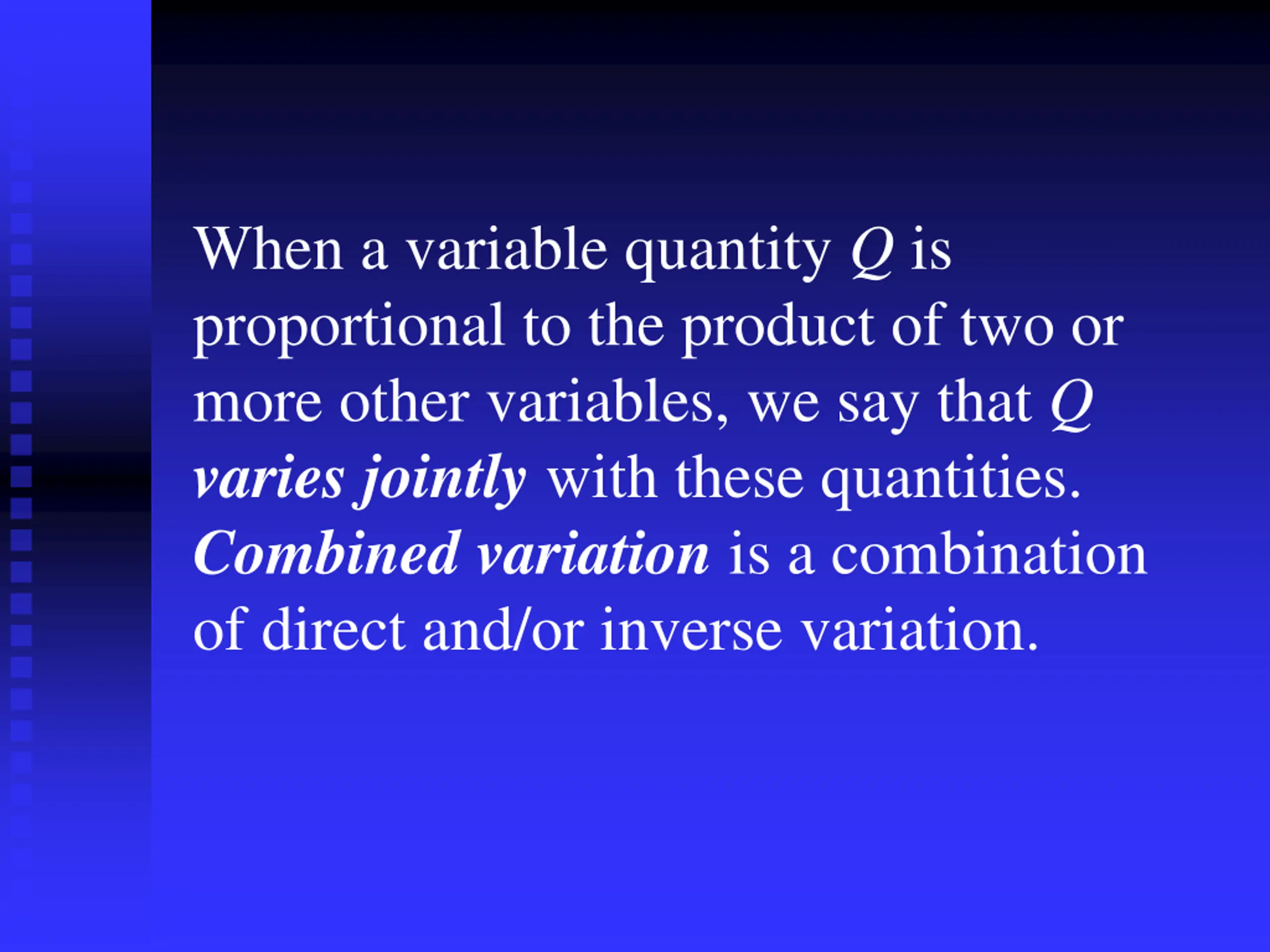 When a variable quantity Q is proportional to the product of two or more other variables, we say that Q varies jointly with these quantities. Combined variationis a combination of direct and/or inverse variation.