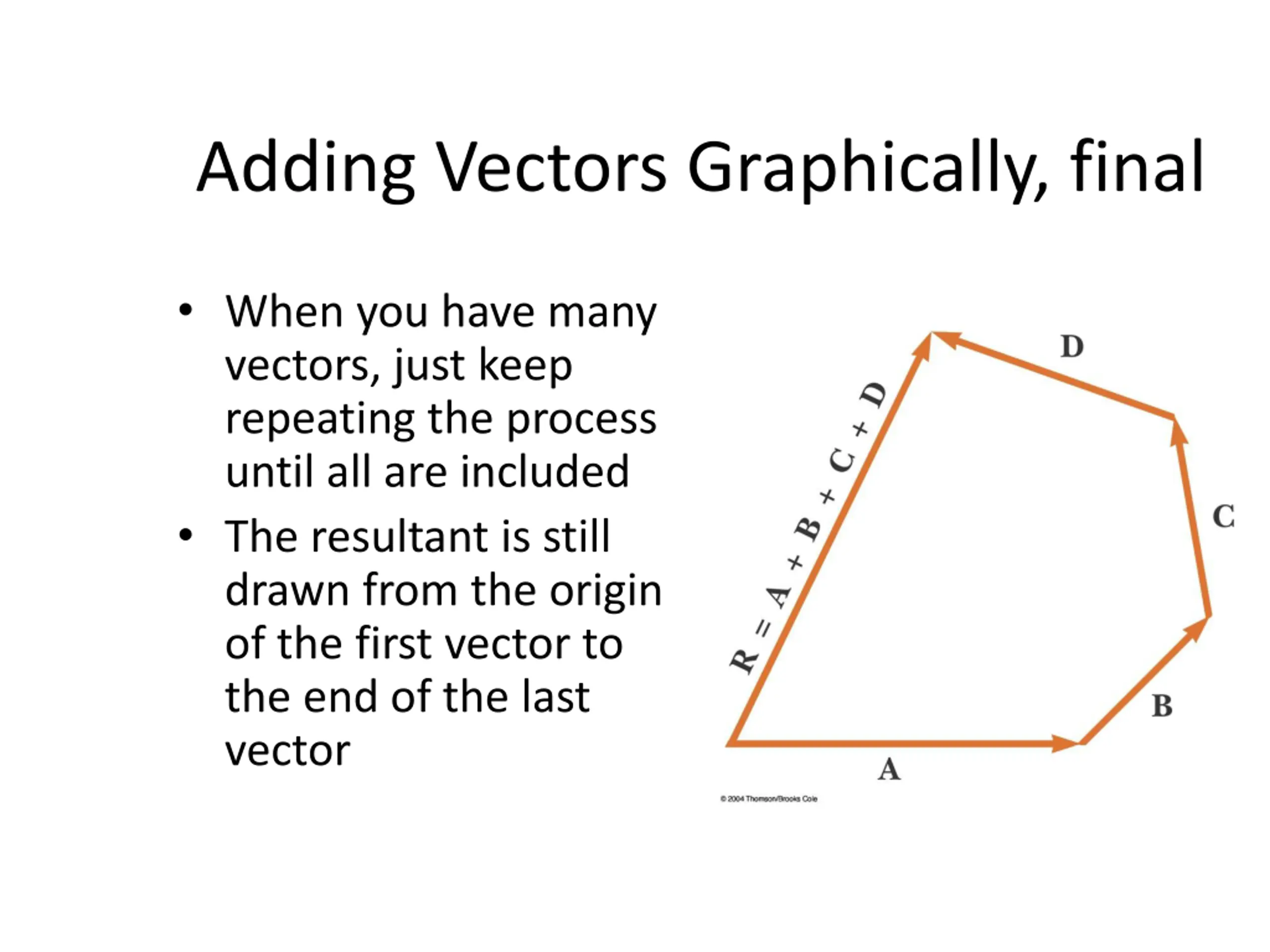 Adding Vectors Graphically, final When you have many vectors, just keep repeating the process until all are included The resultant is still drawn from the origin of the first vector to the end of the last vector