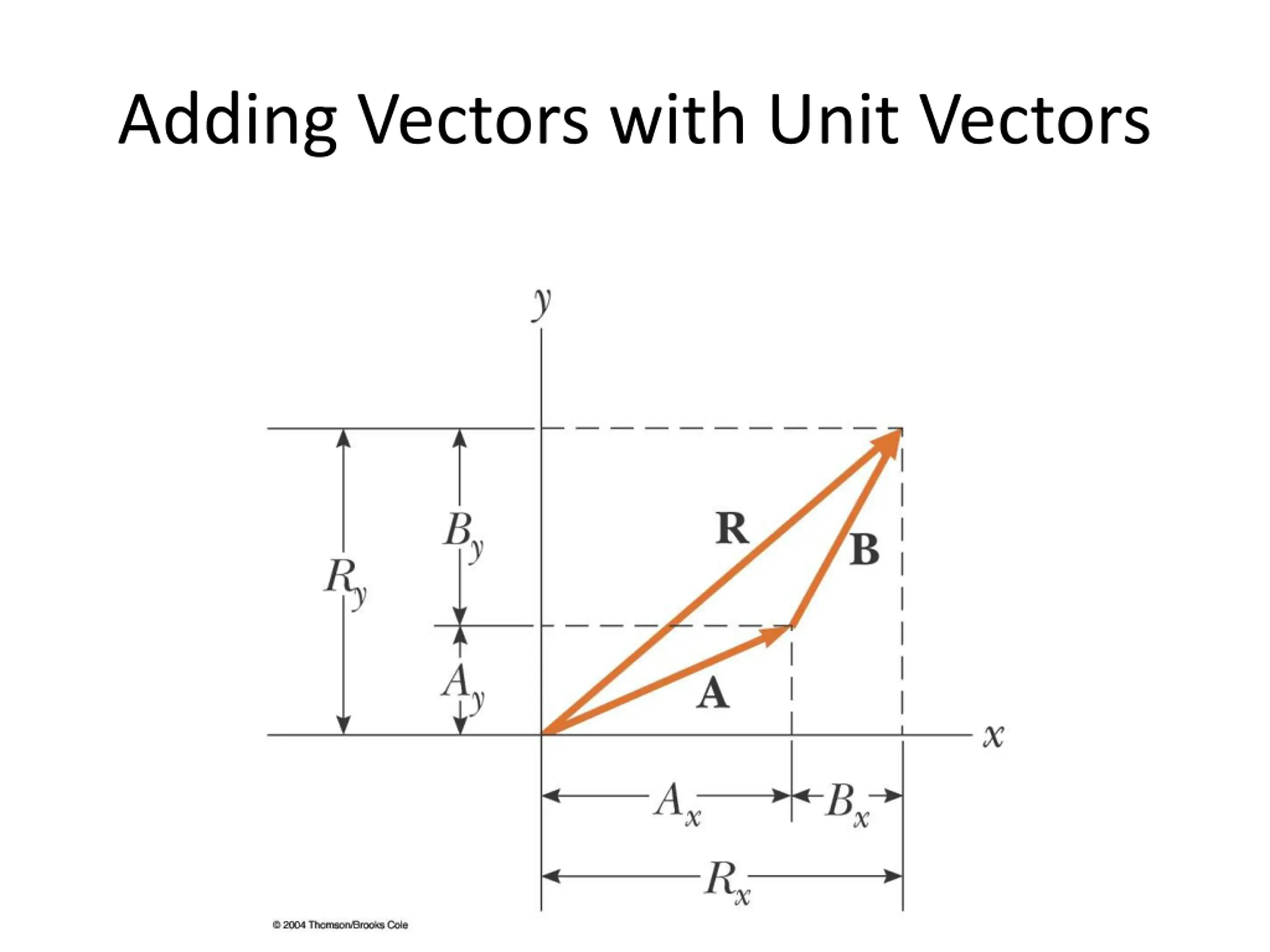 Adding Vectors Using Unit Vectors Using R = A + B Then ( ( R ) ( + i ) i j i j = + + + R A A B B x y x y ( ) ) j = = + + R A B A B x x y y + R R x y and so Rx= Ax+ Bxand Ry= Ay+ By R R = + = y 2 x 2 y 1 tan R R R x