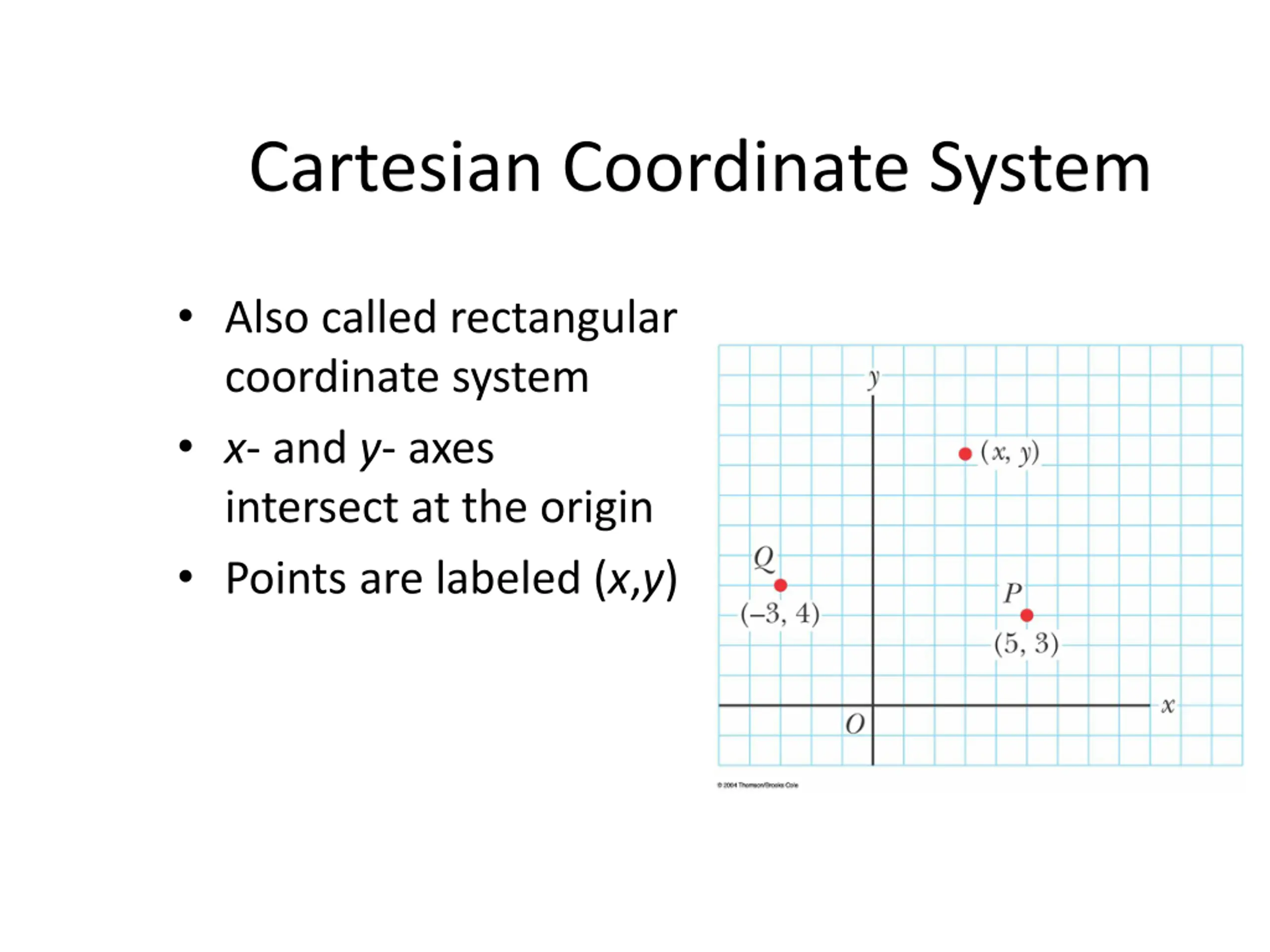 Cartesian Coordinate System Also called rectangular coordinate system x- and y- axes intersect at the origin Points are labeled (x,y)
