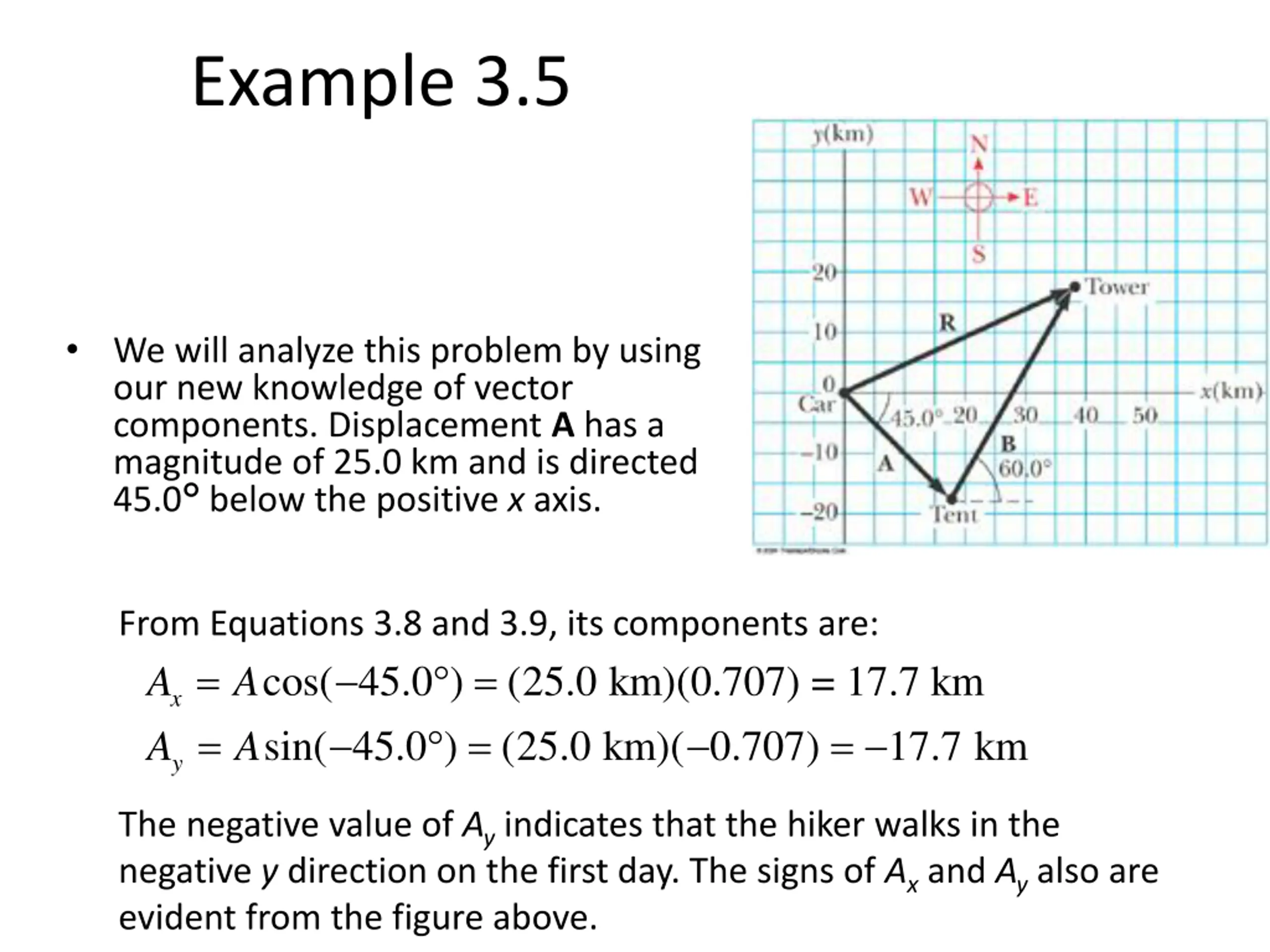 Example 3.5 We will analyze this problem by using our new knowledge of vector components. Displacement A has a magnitude of 25.0 km and is directed 45.0 below the positive x axis. From Equations 3.8 and 3.9, its components are: cos( 45.0 ) sin( 45.0 ) y A A = = = = (25.0 km)(0.707) = 17.7 km (25.0 km)( 0.707) A A x 17.7 km = The negative value of Ay indicates that the hiker walks in the negative y direction on the first day. The signs of Ax and Ay also are evident from the figure above.