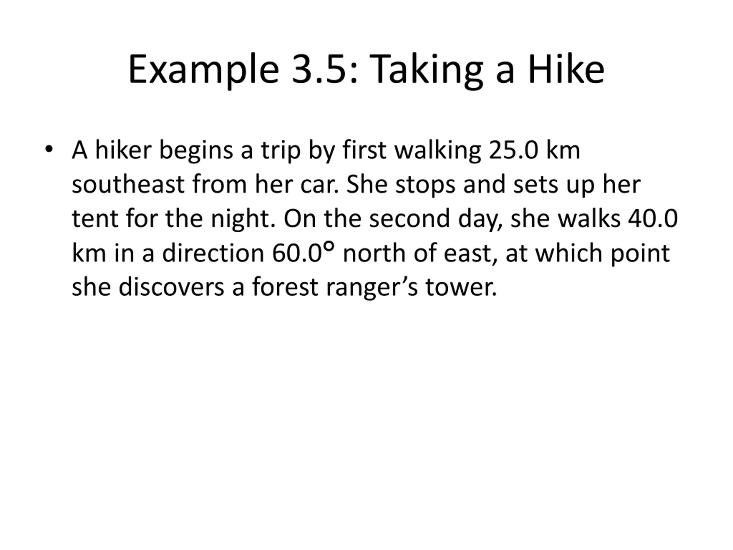Example 3.5: Taking a Hike A hiker begins a trip by first walking 25.0 km southeast from her car. She stops and sets up her tent for the night. On the second day, she walks 40.0 km in a direction 60.0 north of east, at which point she discovers a forest ranger s tower.