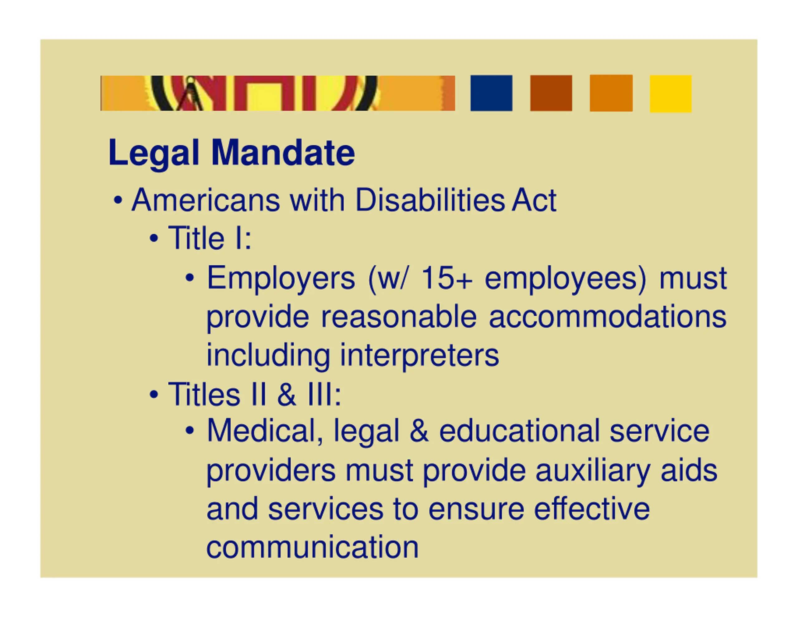 Legal Mandate Americans with DisabilitiesAct Title I: Employers (w/ 15+ employees) must provide reasonable accommodations including interpreters Titles II & III: Medical, legal & educational service providers must provide auxiliary aids and services to ensure effective communication