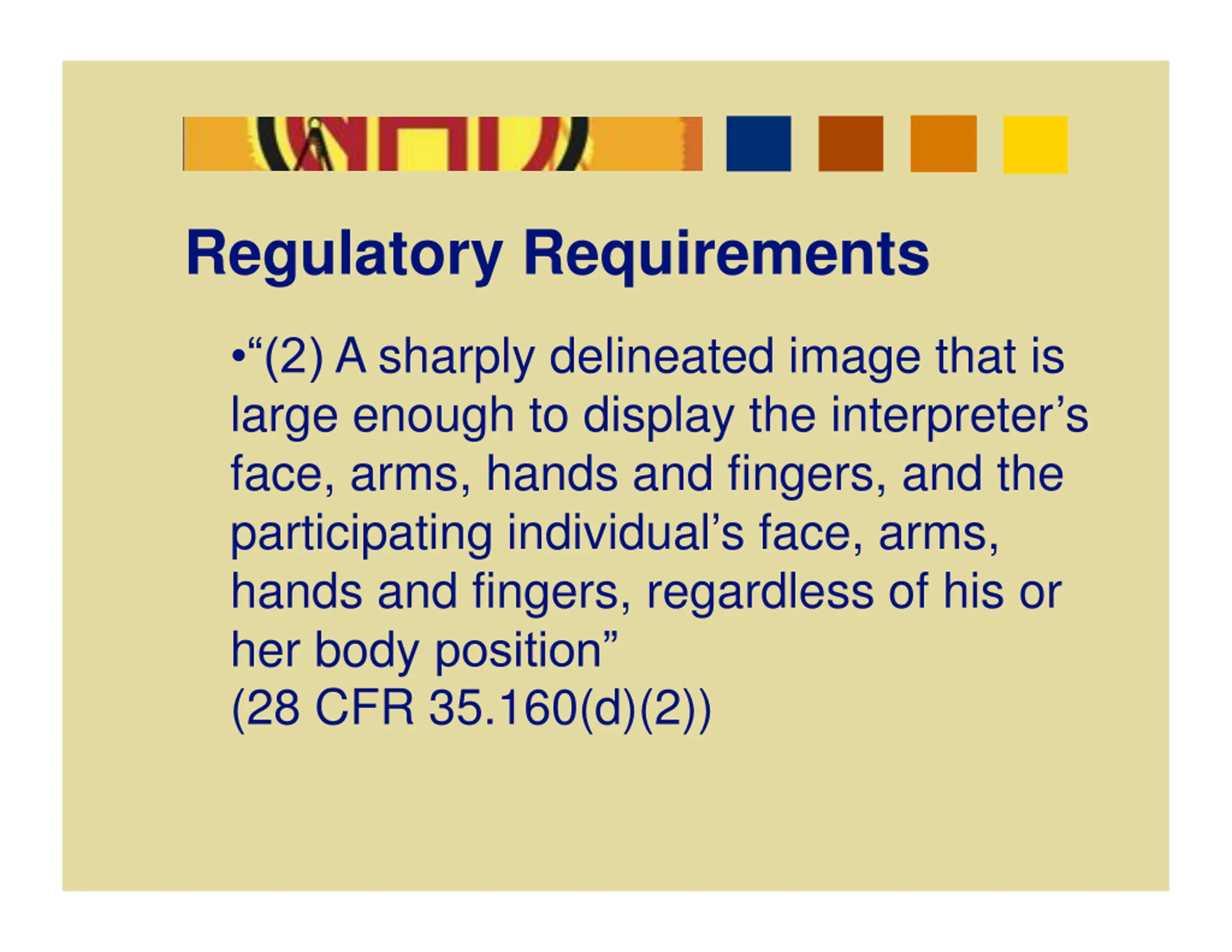 Regulatory Requirements (2) A sharply delineated image that is large enough to display the interpreter s face, arms, hands and fingers, and the participating individual s face, arms, hands and fingers, regardless of his or her body position (28 CFR 35.160(d)(2))