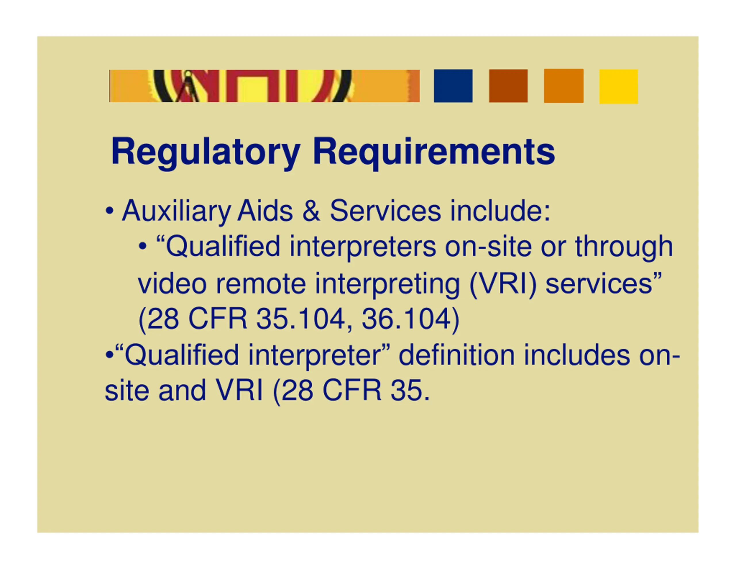 Regulatory Requirements AuxiliaryAids & Services include: Qualified interpreters on-site or through video remote interpreting (VRI) services (28 CFR 35.104, 36.104) Qualified interpreter definition includes on- site and VRI (28 CFR 35.