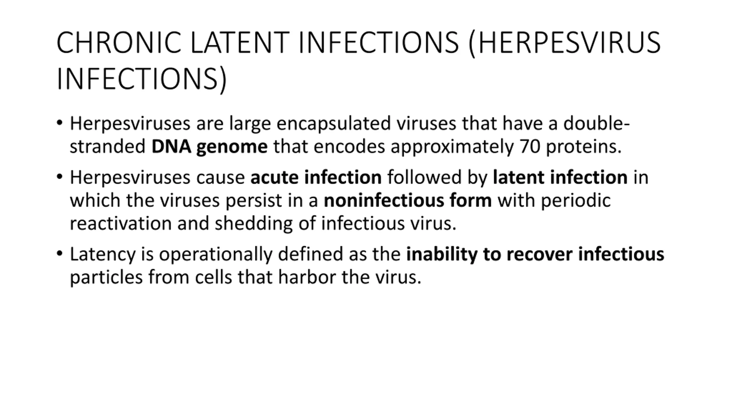 CHRONIC LATENT INFECTIONS (HERPESVIRUS INFECTIONS) Herpesviruses are large encapsulated viruses that have a double- stranded DNA genome that encodes approximately 70 proteins. Herpesviruses cause acute infection followed by latent infection in which the viruses persist in a noninfectious form with periodic reactivation and shedding of infectious virus. Latency is operationally defined as the inability to recover infectious particles from cells that harbor the virus.