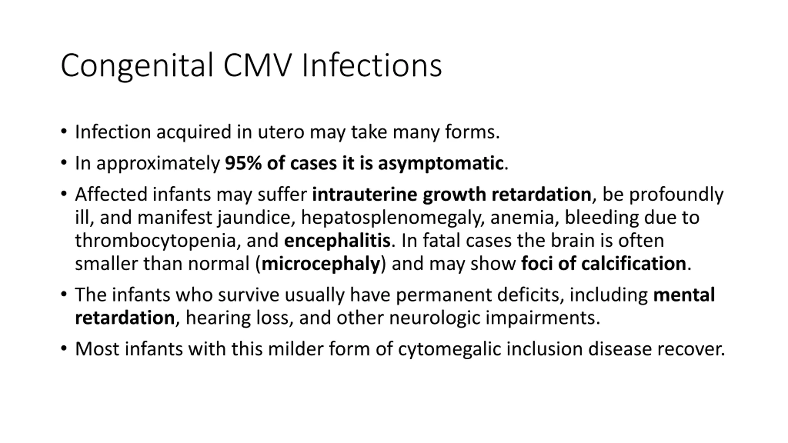 Congenital CMV Infections Infection acquired in utero may take many forms. In approximately 95% of cases it is asymptomatic. Affected infants may suffer intrauterine growth retardation, be profoundly ill, and manifest jaundice, hepatosplenomegaly, anemia, bleeding due to thrombocytopenia, and encephalitis. In fatal cases the brain is often smaller than normal (microcephaly) and may show foci of calcification. The infants who survive usually have permanent deficits, including mental retardation, hearing loss, and other neurologic impairments. Most infants with this milder form of cytomegalic inclusion disease recover.