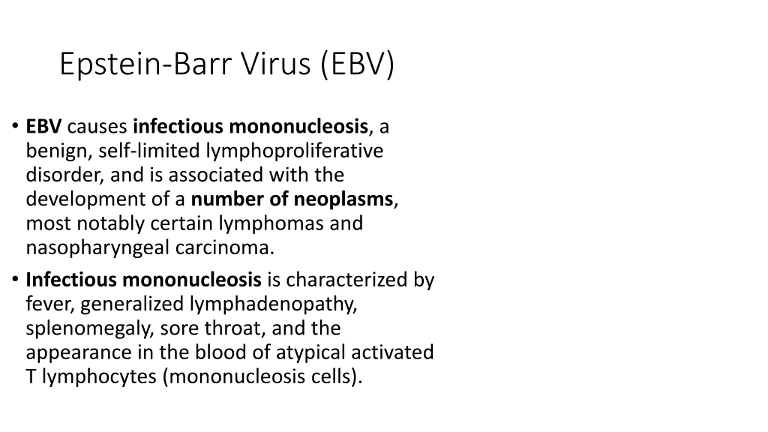 Epstein-Barr Virus (EBV) EBV causes infectious mononucleosis, a benign, self-limited lymphoproliferative disorder, and is associated with the development of a number of neoplasms, most notably certain lymphomas and nasopharyngeal carcinoma. Infectious mononucleosis is characterized by fever, generalized lymphadenopathy, splenomegaly, sore throat, and the appearance in the blood of atypical activated T lymphocytes (mononucleosis cells).