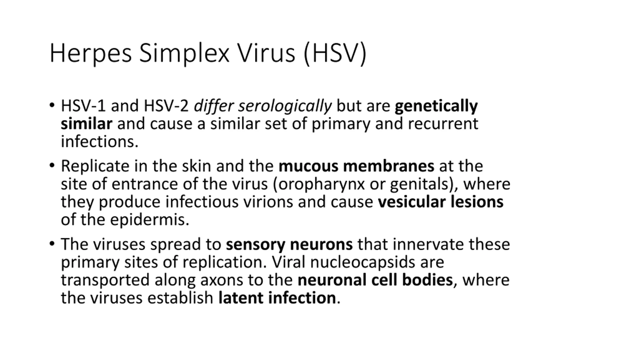 Herpes Simplex Virus (HSV) HSV-1 and HSV-2 differ serologically but are genetically similar and cause a similar set of primary and recurrent infections. Replicate in the skin and the mucous membranes at the site of entrance of the virus (oropharynx or genitals), where they produce infectious virions and cause vesicular lesions of the epidermis. The viruses spread to sensory neurons that innervate these primary sites of replication. Viral nucleocapsids are transported along axons to the neuronal cell bodies, where the viruses establish latent infection.