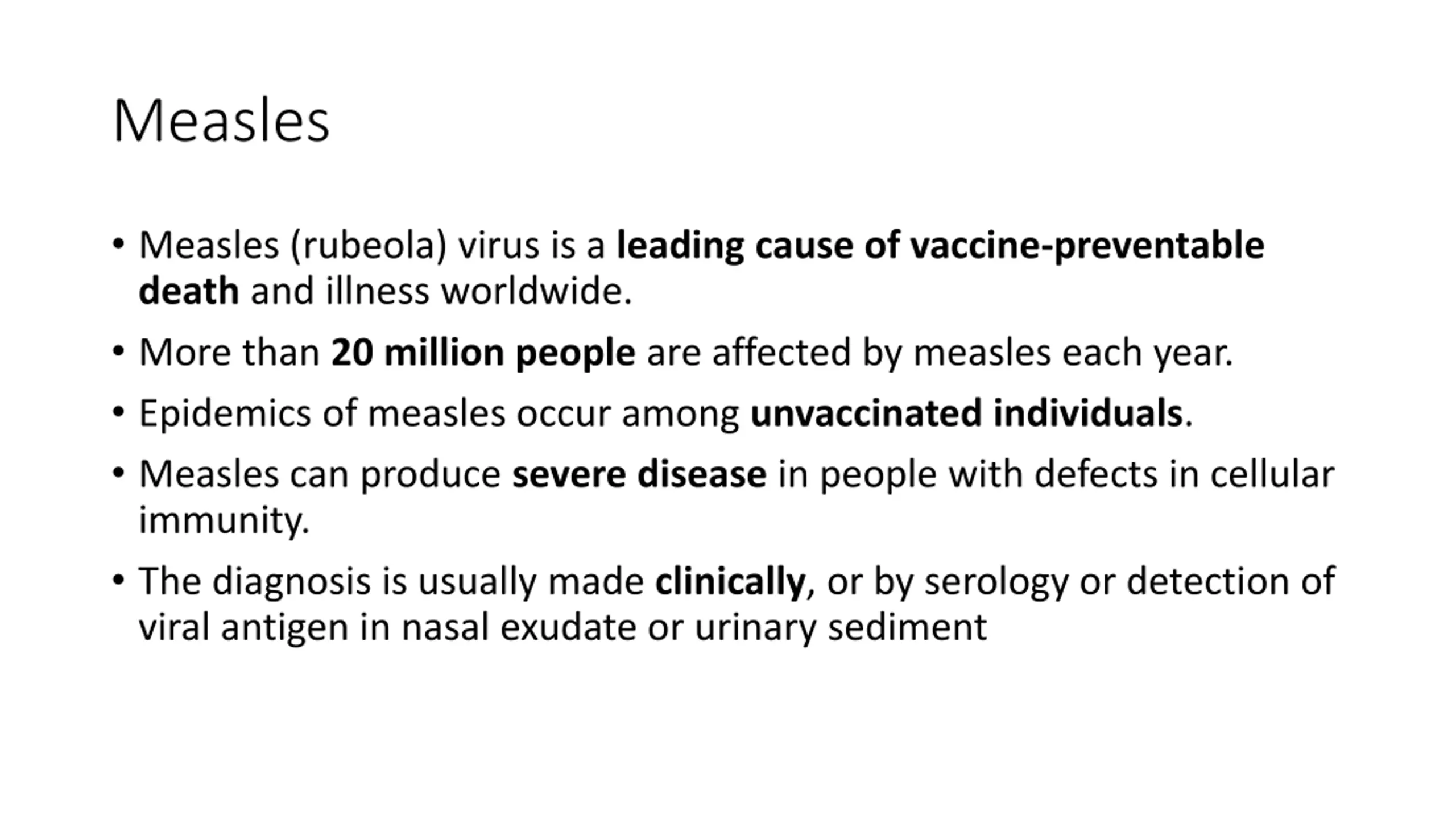 Measles Measles (rubeola) virus is a leading cause of vaccine-preventable death and illness worldwide. More than 20 million people are affected by measles each year. Epidemics of measles occur among unvaccinated individuals. Measles can produce severe disease in people with defects in cellular immunity. The diagnosis is usually made clinically, or by serology or detection of viral antigen in nasal exudate or urinary sediment