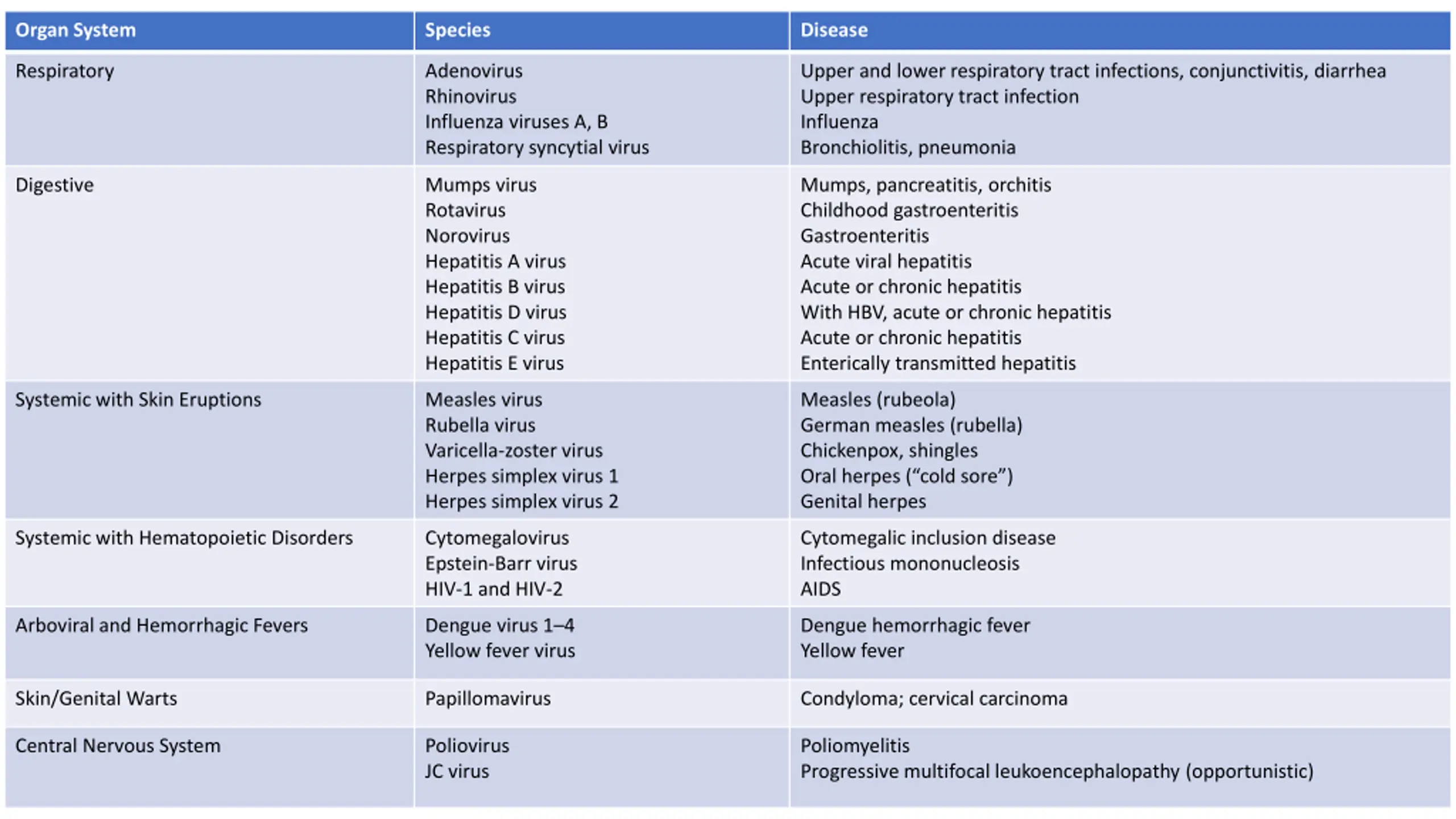 Organ System Species Disease Respiratory Adenovirus Rhinovirus Influenza viruses A, B Respiratory syncytial virus Upper and lower respiratory tract infections, conjunctivitis, diarrhea Upper respiratory tract infection Influenza Bronchiolitis, pneumonia Digestive Mumps virus Rotavirus Norovirus Hepatitis A virus Hepatitis B virus Hepatitis D virus Hepatitis C virus Hepatitis E virus Mumps, pancreatitis, orchitis Childhood gastroenteritis Gastroenteritis Acute viral hepatitis Acute or chronic hepatitis With HBV, acute or chronic hepatitis Acute or chronic hepatitis Enterically transmitted hepatitis Systemic with Skin Eruptions Measles virus Rubella virus Varicella-zoster virus Herpes simplex virus 1 Herpes simplex virus 2 Measles (rubeola) German measles (rubella) Chickenpox, shingles Oral herpes ( cold sore ) Genital herpes Systemic with Hematopoietic Disorders Cytomegalovirus Epstein-Barr virus HIV-1 and HIV-2 Cytomegalic inclusion disease Infectious mononucleosis AIDS Arboviral and Hemorrhagic Fevers Dengue virus 1 4 Yellow fever virus Dengue hemorrhagic fever Yellow fever Skin/Genital Warts Papillomavirus Condyloma; cervical carcinoma Central Nervous System Poliovirus JC virus Poliomyelitis Progressive multifocal leukoencephalopathy (opportunistic)