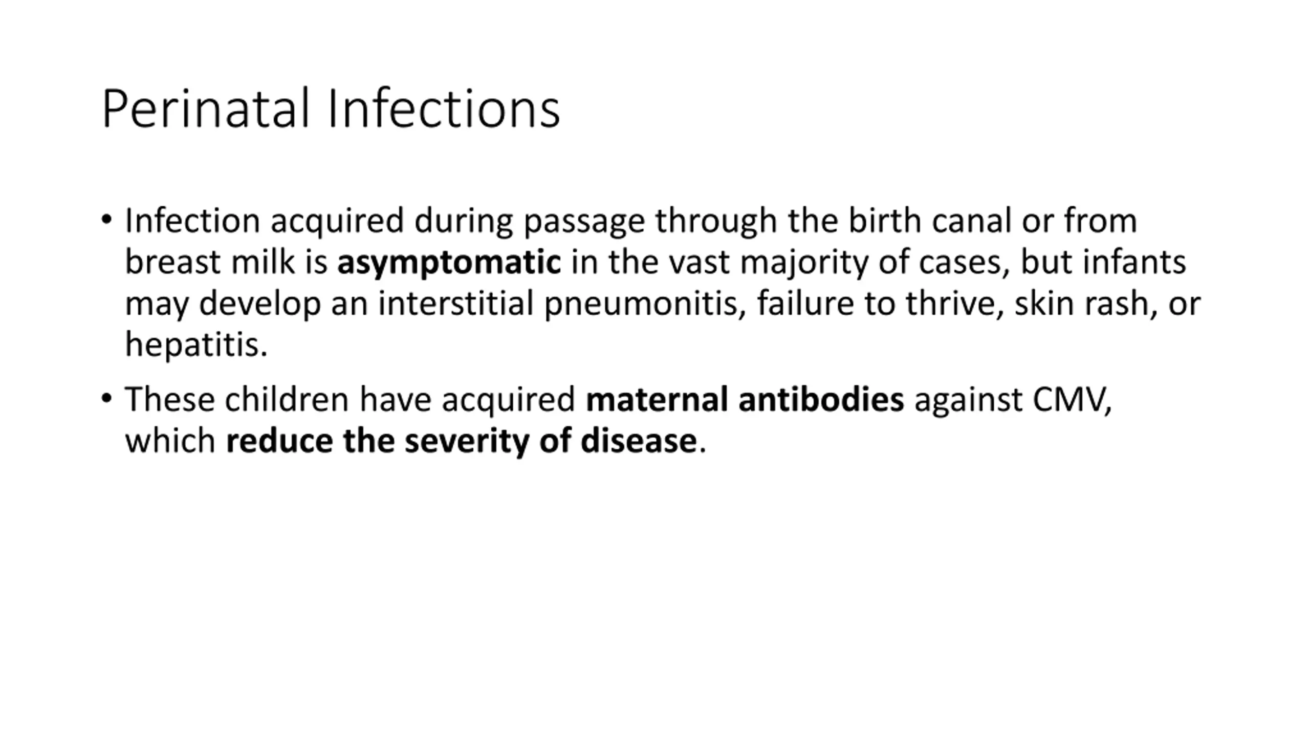 Perinatal Infections Infection acquired during passage through the birth canal or from breast milk is asymptomatic in the vast majority of cases, but infants may develop an interstitial pneumonitis, failure to thrive, skin rash, or hepatitis. These children have acquired maternal antibodies against CMV, which reduce the severity of disease.