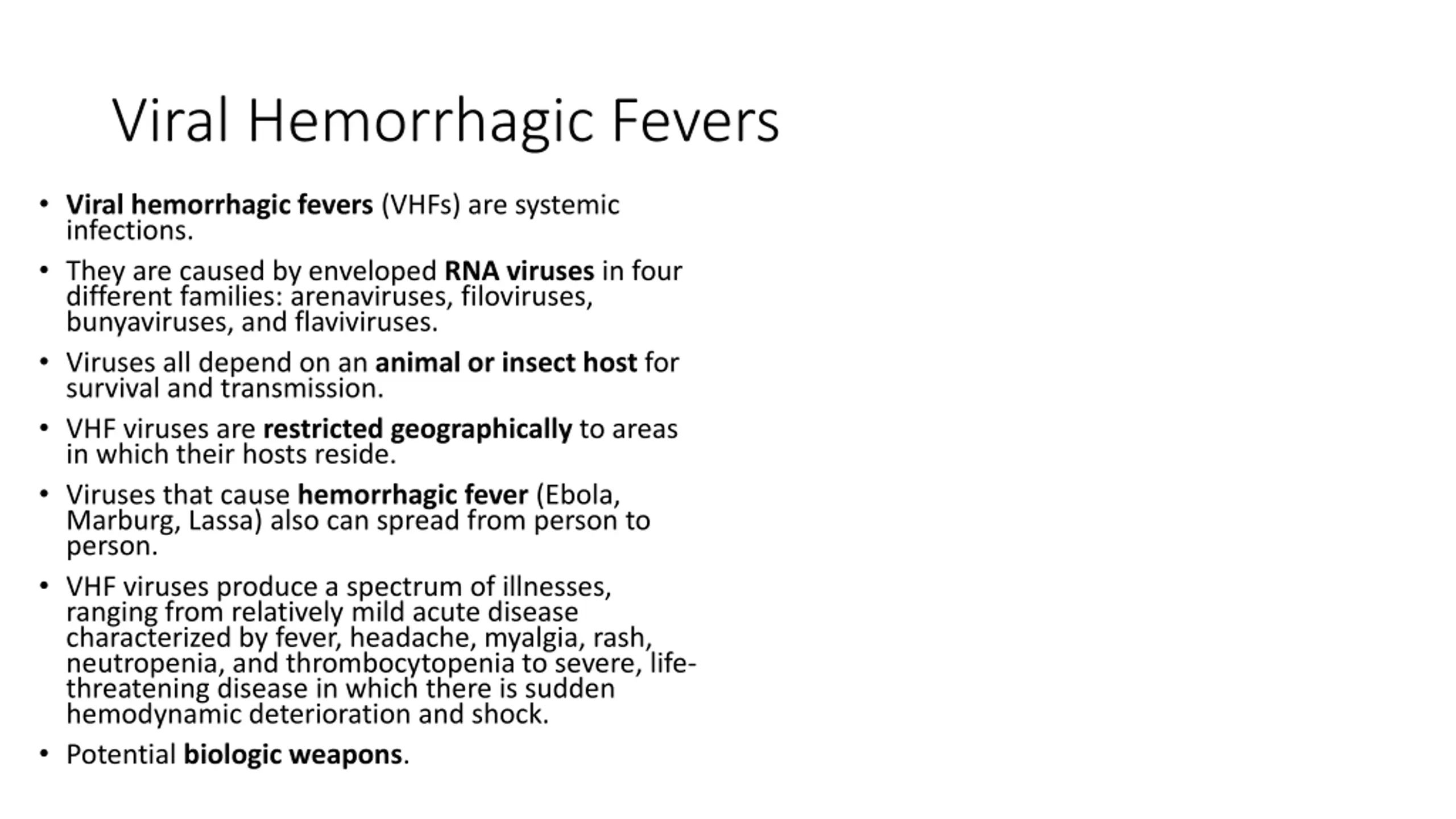 Viral Hemorrhagic Fevers Viral hemorrhagic fevers (VHFs) are systemic infections. They are caused by enveloped RNA viruses in four different families: arenaviruses, filoviruses, bunyaviruses, and flaviviruses. Viruses all depend on an animal or insect host for survival and transmission. VHF viruses are restricted geographically to areas in which their hosts reside. Viruses that cause hemorrhagic fever (Ebola, Marburg, Lassa) also can spread from person to person. VHF viruses produce a spectrum of illnesses, ranging from relatively mild acute disease characterized by fever, headache, myalgia, rash, neutropenia, and thrombocytopenia to severe, life- threatening disease in which there is sudden hemodynamic deterioration and shock. Potential biologic weapons.