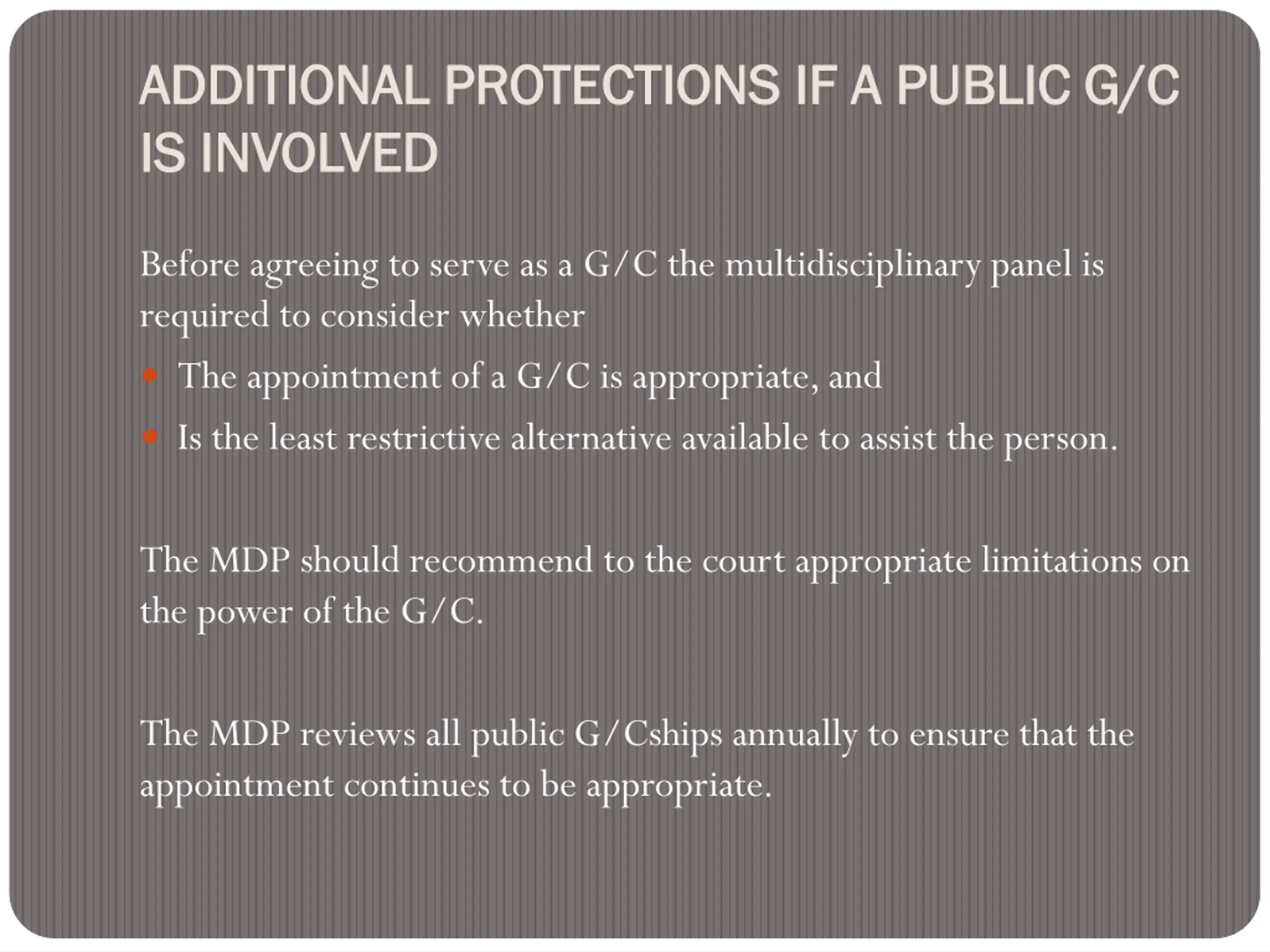ADDITIONAL PROTECTIONS ADDITIONAL PROTECTIONS IF A PUBLIC IS IS INVOLVED INVOLVED IF A PUBLIC G/C G/C Before agreeing to serve as a G/C the multidisciplinary panel is required to consider whether The appointment of a G/C is appropriate, and Is the least restrictive alternative available to assist the person. The MDP should recommend to the court appropriate limitations on the power of the G/C. The MDP reviews all public G/Cships annually to ensure that the appointment continues to be appropriate.