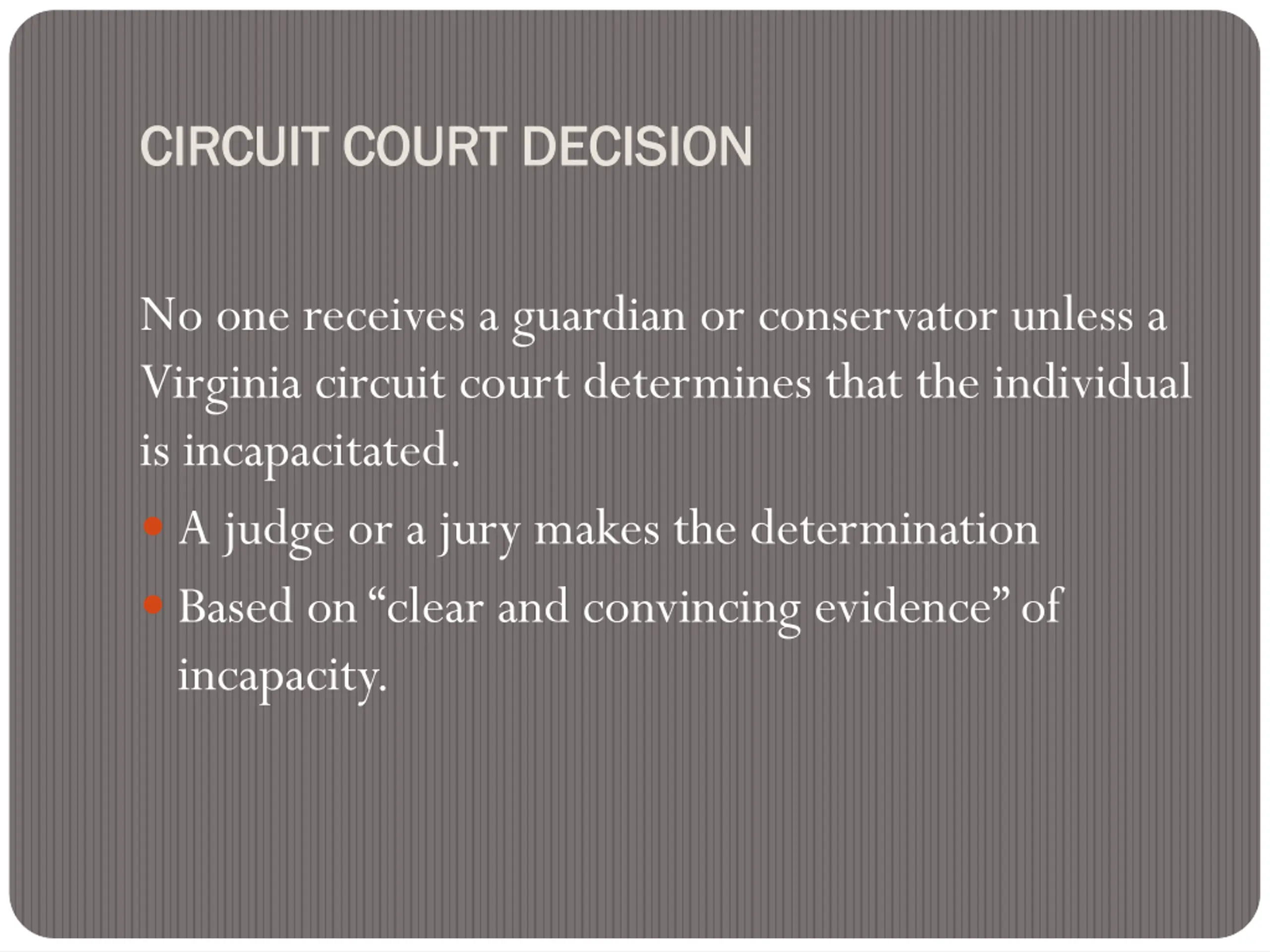 CIRCUIT COURT DECISION CIRCUIT COURT DECISION No one receives a guardian or conservator unless a Virginia circuit court determines that the individual is incapacitated. A judge or a jury makes the determination Based on clear and convincing evidence of incapacity.