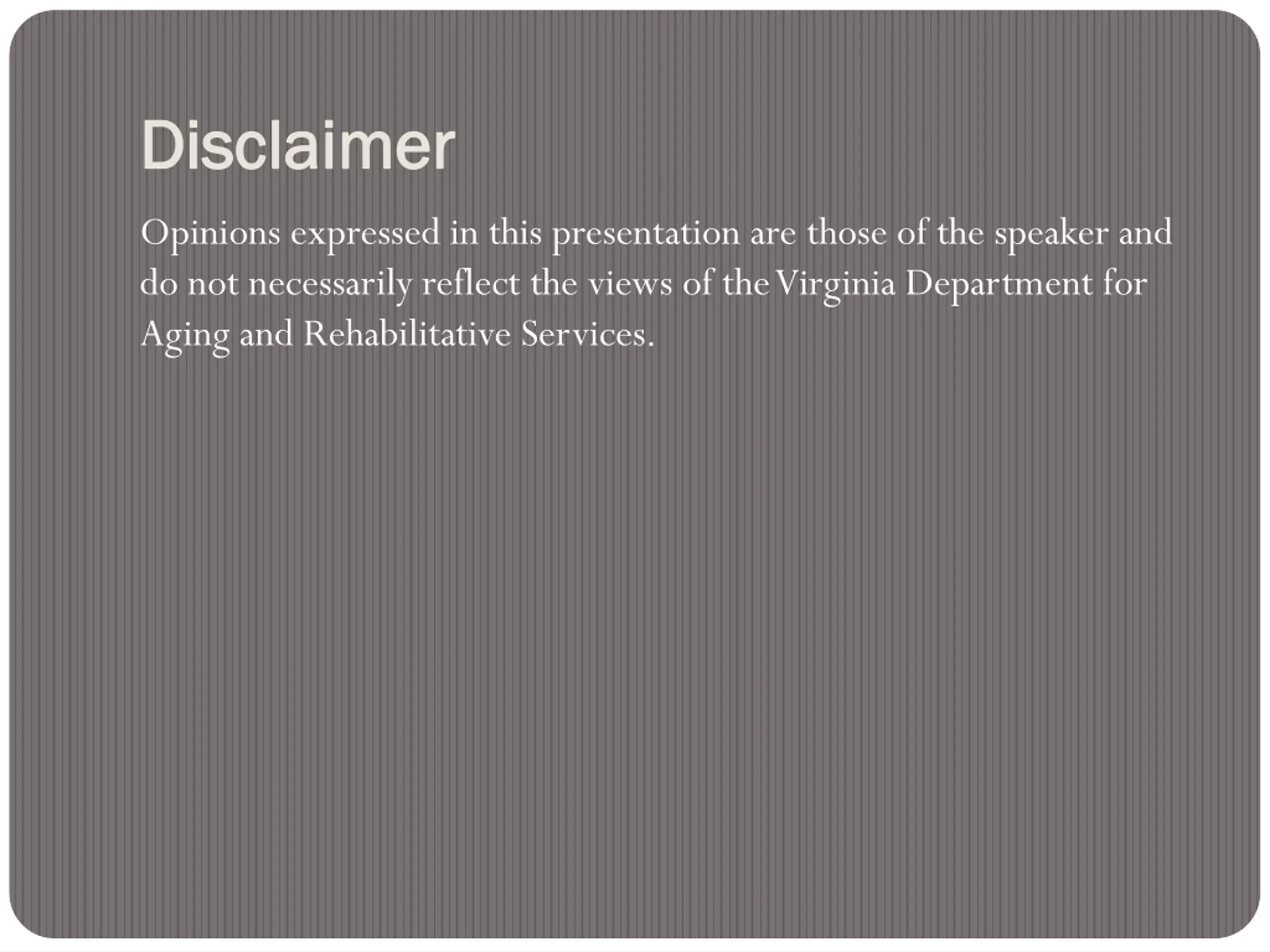 Disclaimer Disclaimer Opinions expressed in this presentation are those of the speaker and do not necessarily reflect the views of the Virginia Department for Aging and Rehabilitative Services.