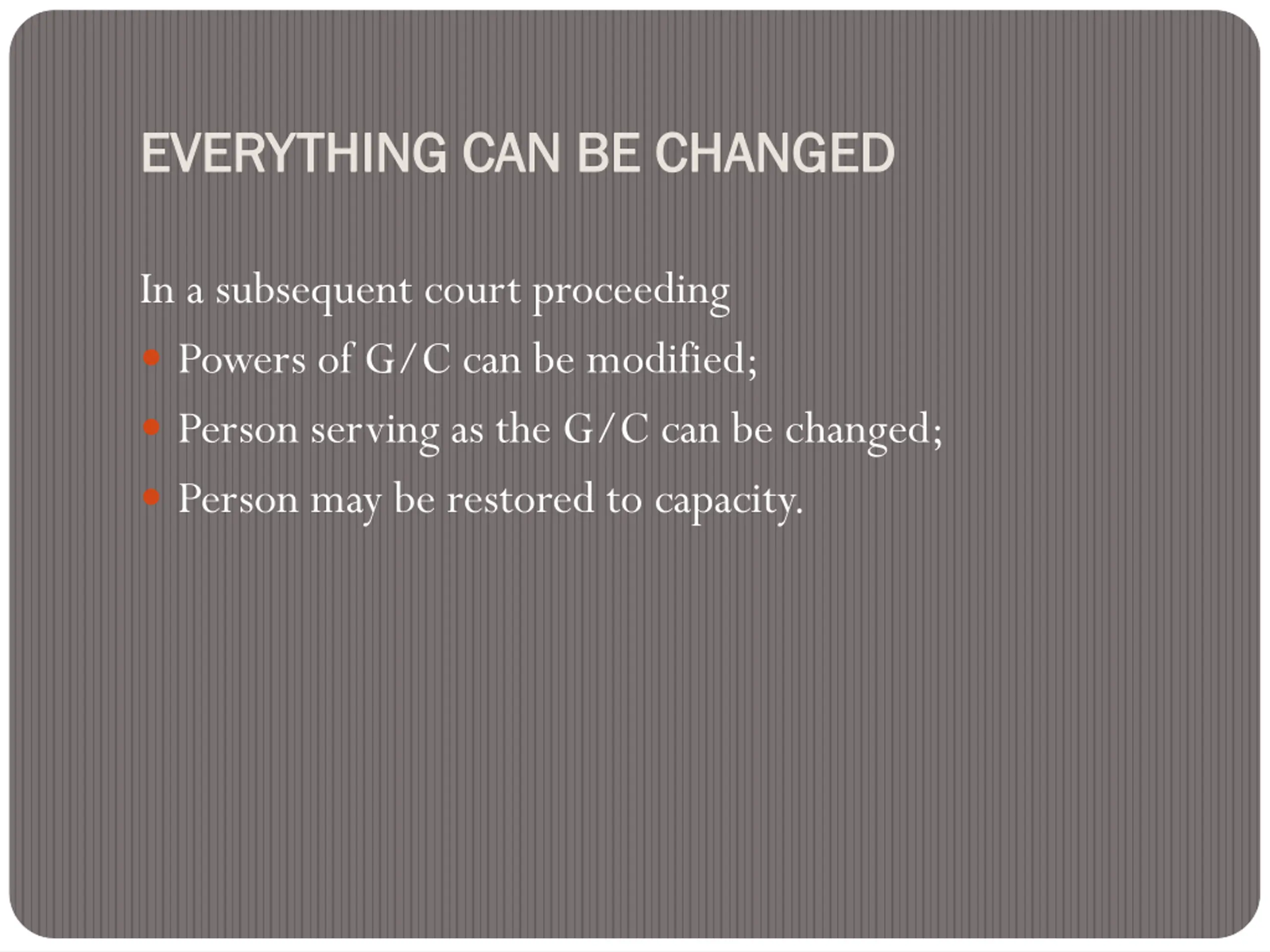 EVERYTHING CAN BE CHANGED EVERYTHING CAN BE CHANGED In a subsequent court proceeding Powers of G/C can be modified; Person serving as the G/C can be changed; Person may be restored to capacity.