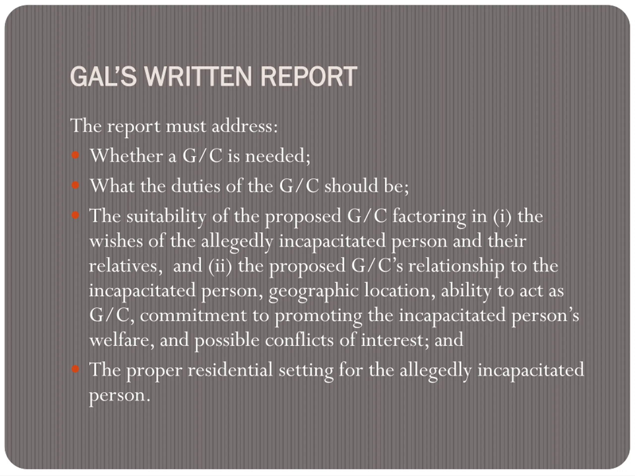 GALS WRITTEN GAL S WRITTEN REPORT REPORT The report must address: Whether a G/C is needed; What the duties of the G/C should be; The suitability of the proposed G/C factoring in (i) the wishes of the allegedly incapacitated person and their relatives, and (ii) the proposed G/C s relationship to the incapacitated person, geographic location, ability to act as G/C, commitment to promoting the incapacitated person s welfare, and possible conflicts of interest; and The proper residential setting for the allegedly incapacitated person.