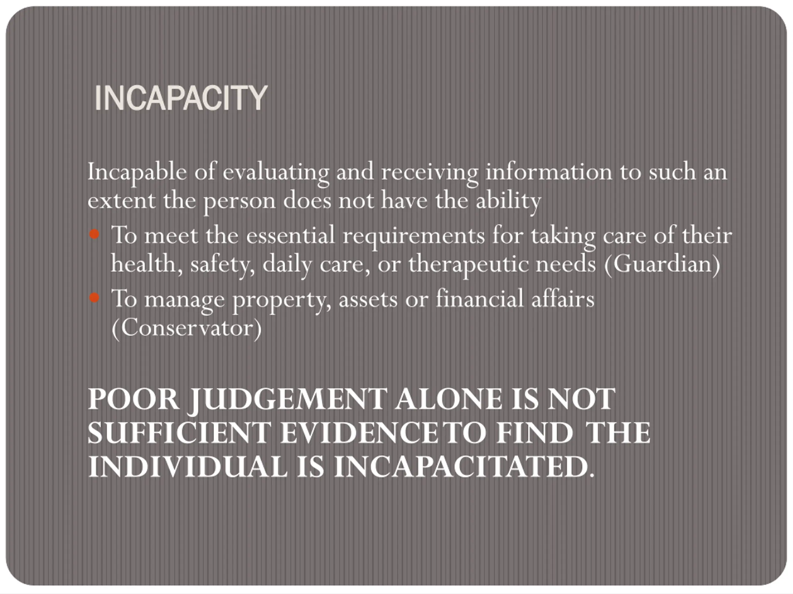 INCAPACITY INCAPACITY Incapable of evaluating and receiving information to such an extent the person does not have the ability To meet the essential requirements for taking care of their health, safety, daily care, or therapeutic needs (Guardian) To manage property, assets or financial affairs (Conservator) POOR JUDGEMENT ALONE IS NOT SUFFICIENT EVIDENCE TO FIND THE INDIVIDUAL IS INCAPACITATED.